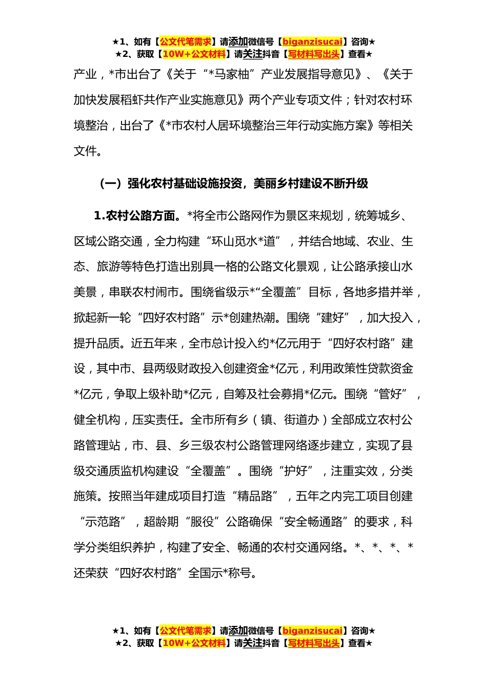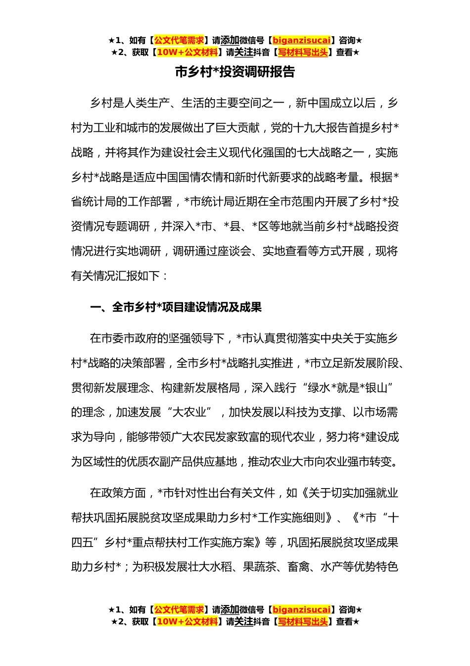 ★1、如有【公文代笔需求】请添加微信号【biganzisucai】咨询★★2、获取【10W+公文材料】请关注抖音【写材料写出头】查看★市乡村*投资调研报告乡村是人类生产、生活的主要空间之一,新中国成立以后,乡村为工业和城市的发展做出了巨大贡献,党的十九大报告首提乡村*战略,并将其作为建设社会主义现代化强国的七大战略之一,实施乡村*战略是适应中国国情农情和新时代新要求的战略考量。根据*省统计局的工作部署,*市统计局近期在全市范围内开展了乡村*投资情况专题调研,并深入*市、*县、*区等地就当前乡村*战略投资情况进行实地调研,调研通过座谈会、实地查看等方式开展,现将有关情况汇报如下:一、全市乡村*项目建设情况及成果在市委市政府的坚强领导下,*市认真贯彻落实中央关于实施乡村*战略的决策部署,全...