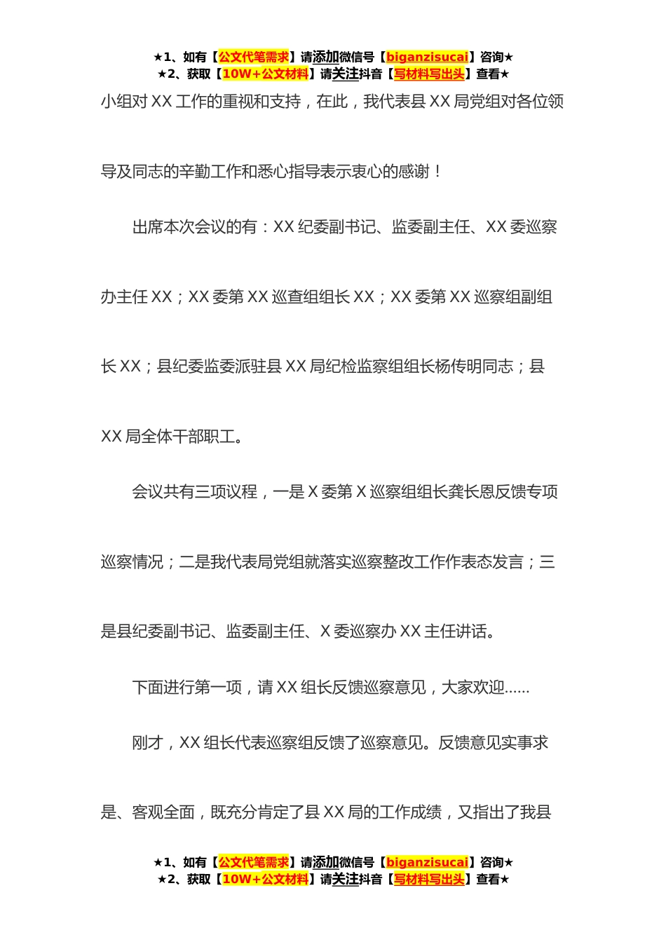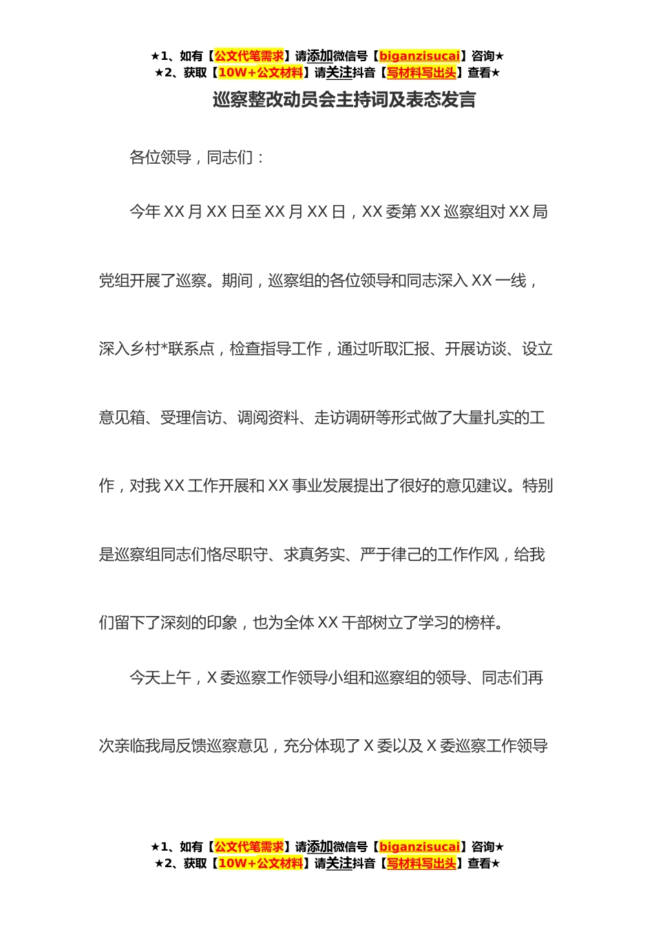 ★1、如有【公文代笔需求】请添加微信号【biganzisucai】咨询★★2、获取【10W+公文材料】请关注抖音【写材料写出头】查看★巡察整改动员会主持词及表态发言各位领导,同志们:今年XX月XX日至XX月XX日,XX委第XX巡察组对XX局党组开展了巡察。期间,巡察组的各位领导和同志深入XX一线,深入乡村*联系点,检查指导工作,通过听取汇报、开展访谈、设立意见箱、受理信访、调阅资料、走访调研等形式做了大量扎实的工作,对我XX工作开展和XX事业发展提出了很好的意见建议。特别是巡察组同志们恪尽职守、求真务实、严于律己的工作作风,给我们留下了深刻的印象,也为全体XX干部树立了学习的榜样。今天上午,X委巡察工作领导小组和巡察组的领导、同志们再次亲临我局反馈巡察意见,充分体现了X委以及X委巡察工作领导★1、如...