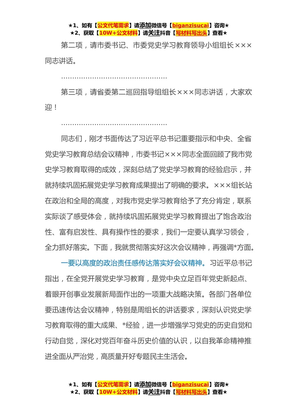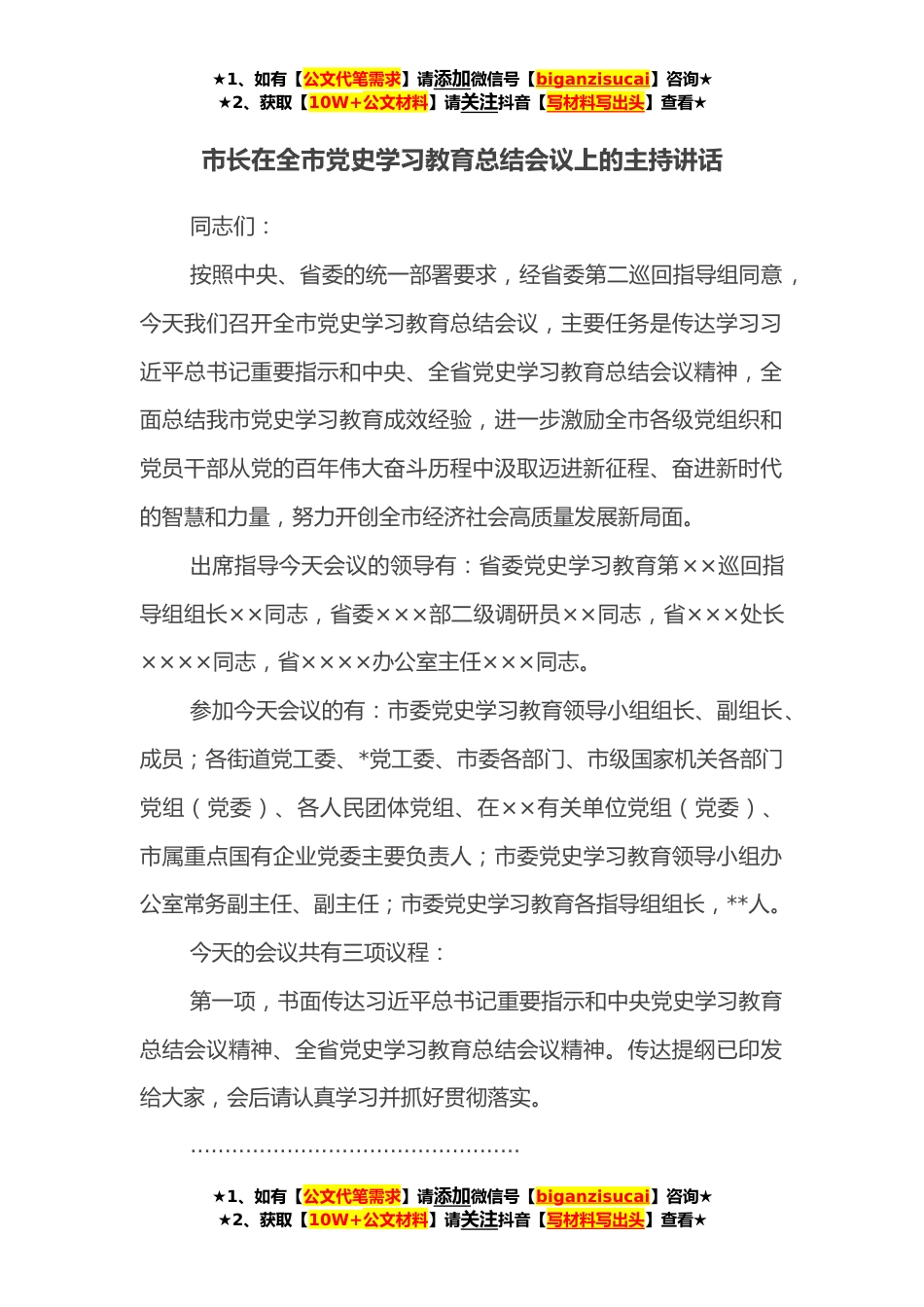 ★1、如有【公文代笔需求】请添加微信号【biganzisucai】咨询★★2、获取【10W+公文材料】请关注抖音【写材料写出头】查看★市长在全市党史学习教育总结会议上的主持讲话同志们:按照中央、省委的统一部署要求,经省委第二巡回指导组同意,今天我们召开全市党史学习教育总结会议,主要任务是传达学习习近平总书记重要指示和中央、全省党史学习教育总结会议精神,全面总结我市党史学习教育成效经验,进一步激励全市各级党组织和党员干部从党的百年伟大奋斗历程中汲取迈进新征程、奋进新时代的智慧和力量,努力开创全市经济社会高质量发展新局面。出席指导今天会议的领导有:省委党史学习教育第××巡回指导组组长××同志,省委×××部二级调研员××同志,省×××处长××××同志,省××××办公室主任×××...