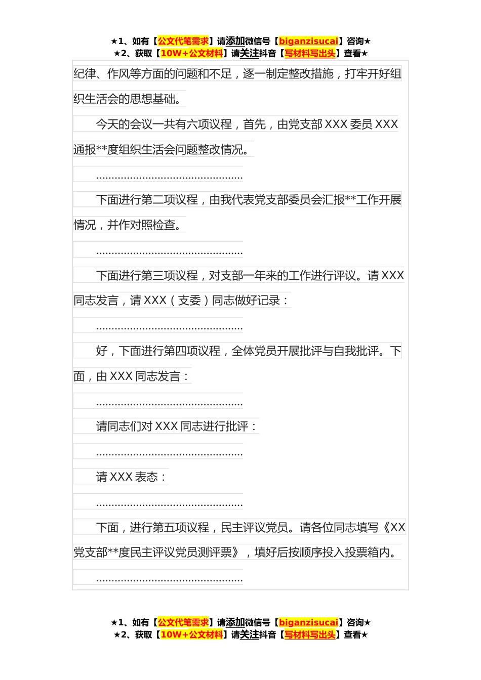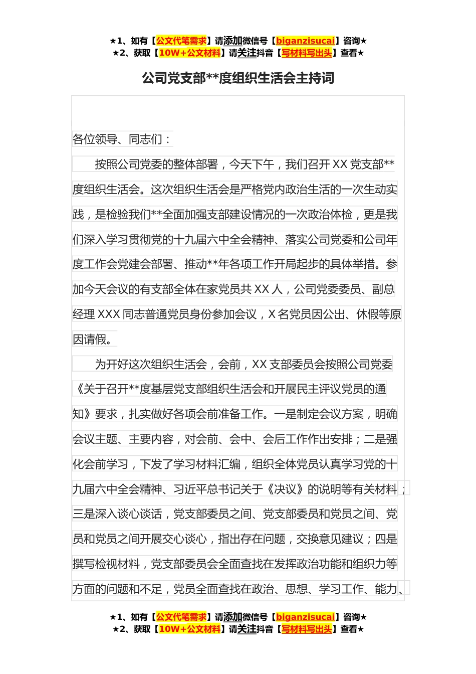 ★1、如有【公文代笔需求】请添加微信号【biganzisucai】咨询★★2、获取【10W+公文材料】请关注抖音【写材料写出头】查看★公司党支部**度组织生活会主持词各位领导、同志们:按照公司党委的整体部署,今天下午,我们召开XX党支部**度组织生活会。这次组织生活会是严格党内政治生活的一次生动实践,是检验我们**全面加强支部建设情况的一次政治体检,更是我们深入学习贯彻党的十九届六中全会精神、落实公司党委和公司年度工作会党建会部署、推动**年各项工作开局起步的具体举措。参加今天会议的有支部全体在家党员共XX人,公司党委委员、副总经理XXX同志普通党员身份参加会议,X名党员因公出、休假等原因请假。为开好这次组织生活会,会前,XX支部委员会按照公司党委《关于召开**度基层党支部组织生活会和开展民...