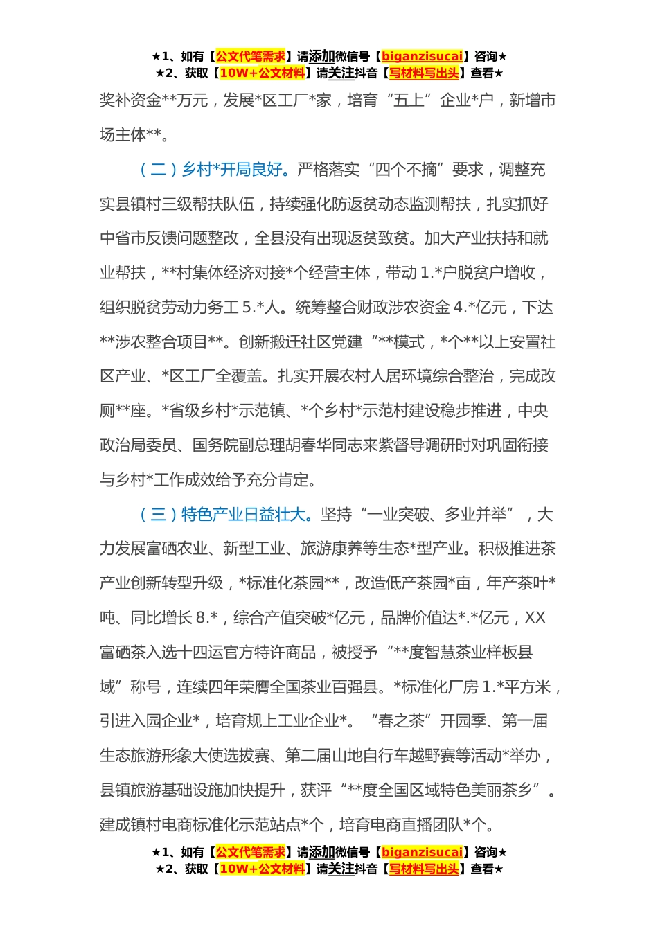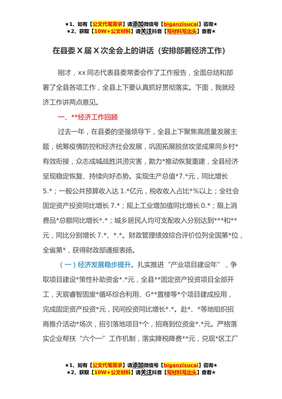 ★1、如有【公文代笔需求】请添加微信号【biganzisucai】咨询★★2、获取【10W+公文材料】请关注抖音【写材料写出头】查看★在县委X届X次全会上的讲话(安排部署经济工作)刚才,xx同志代表县委常委会作了工作报告,全面总结和部署了全县各项工作,全县上下要认真抓好贯彻落实。下面,我就经济工作讲两点意见。一、**经济工作回顾过去一年,在县委的坚强领导下,全县上下聚焦高质量发展主题,统筹疫情防控和经济社会发展,巩固拓展脱贫攻坚成果同乡村*有效衔接,众志成城战胜洪涝灾害,勠力*推动恢复重建,全县经济呈现稳定恢复、持续向好态势。实现生产总值*7.*元,同比增长5.*;一般公共预算收入达1.*亿元,税收收入占比*%以上;全社会固定资产投资同比增长7.*;规上工业增加值同比增长0.*;限上消费品*总额同...