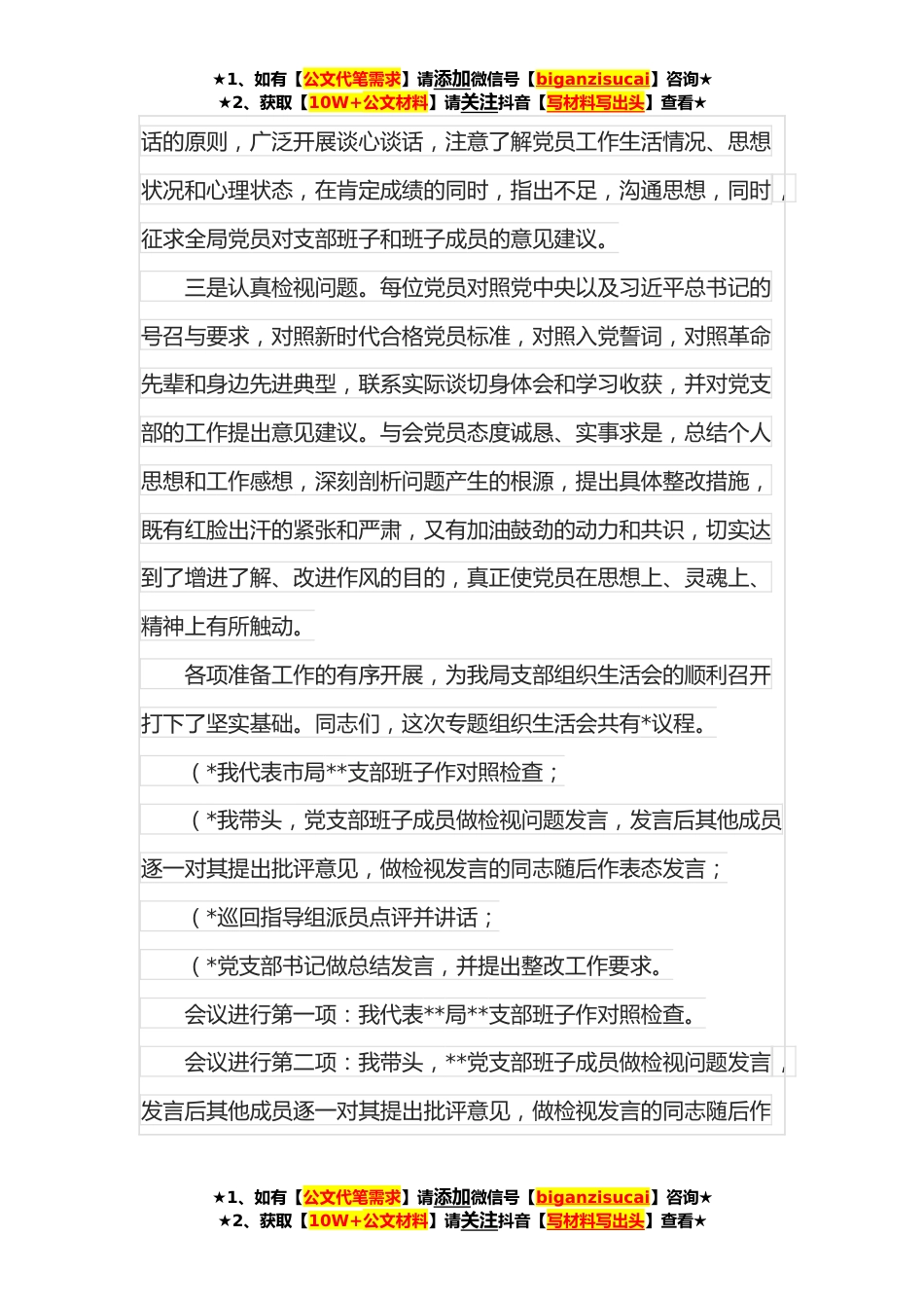 ★1、如有【公文代笔需求】请添加微信号【biganzisucai】咨询★★2、获取【10W+公文材料】请关注抖音【写材料写出头】查看★民政局党支部组织生活会主持词同志们:现在开会。按照**市委**领导小组《关于开好**度组织生活会和民主评议党员工作的通知》要求,根据党章和党内有关规定,今天我们召开**度**局组织生活会。在市巡回指导组和上级党委的精心指导下,**党支部班子围绕开好专题组织生活会做了以下准备工作:一是组织集中学习。结合单位实际和职能职责,各党支部组织党员深入学习习近平总书记“七一”重要讲话及对**重要讲话和指示精神等,学习党的十九届六中全会精神特别是《中共中央关于党的百年奋斗重大成就和历史经验的决议》等全会文件和辅导材料,学习习近平总书记重要指示和全国党史学习教育总结会议...