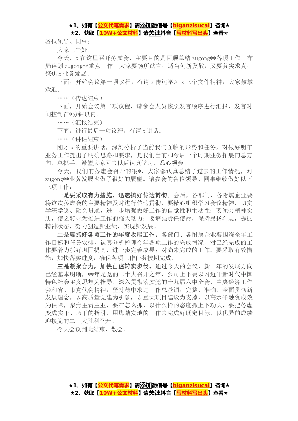 ★1、如有【公文代笔需求】请添加微信号【biganzisucai】咨询★★2、获取【10W+公文材料】请关注抖音【写材料写出头】查看★各位领导、同事:大家上午好。今天,x在这里召开务虚会,主要目的是回顾总结zugong**各项工作,布局谋划zugong**重点工作。大家要畅所欲言,适当创新发散,又要务实求真,聚焦x业务发展。下面,开始会议第一项议程,有请x传达学习x三个文件精神,大家鼓掌欢迎。……(传达结束)下面,开始会议第二项议程,请参会人员按照发言顺序进行汇报,发言时间控制在*分钟以内。……(汇报结束)下面,进行最后一项议程,有请x讲话。……(讲话结束)刚才x的重要讲话,深刻分析了当前我们面临的形势和任务,对做好明年业务工作提出了明确思路和要求,是我们当前和今后一个时期业务拓展的总方向、总抓...