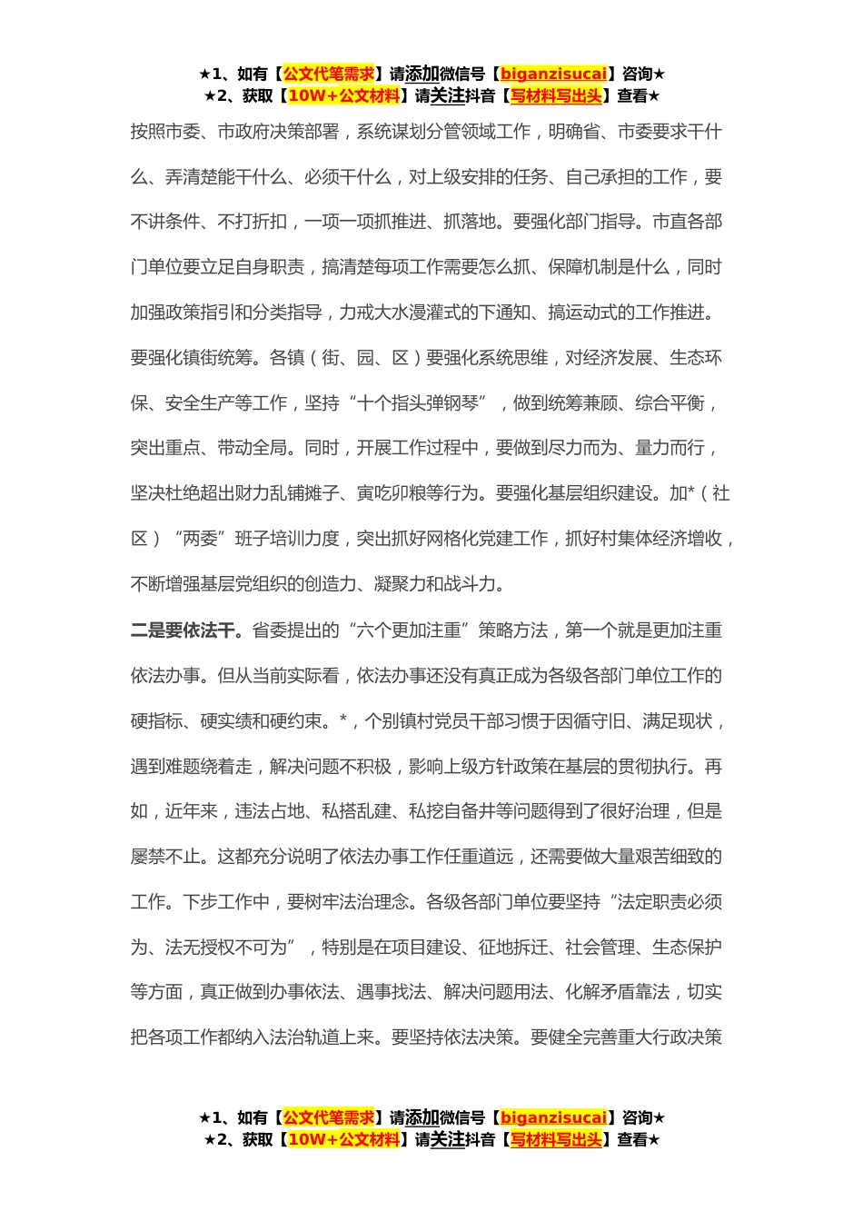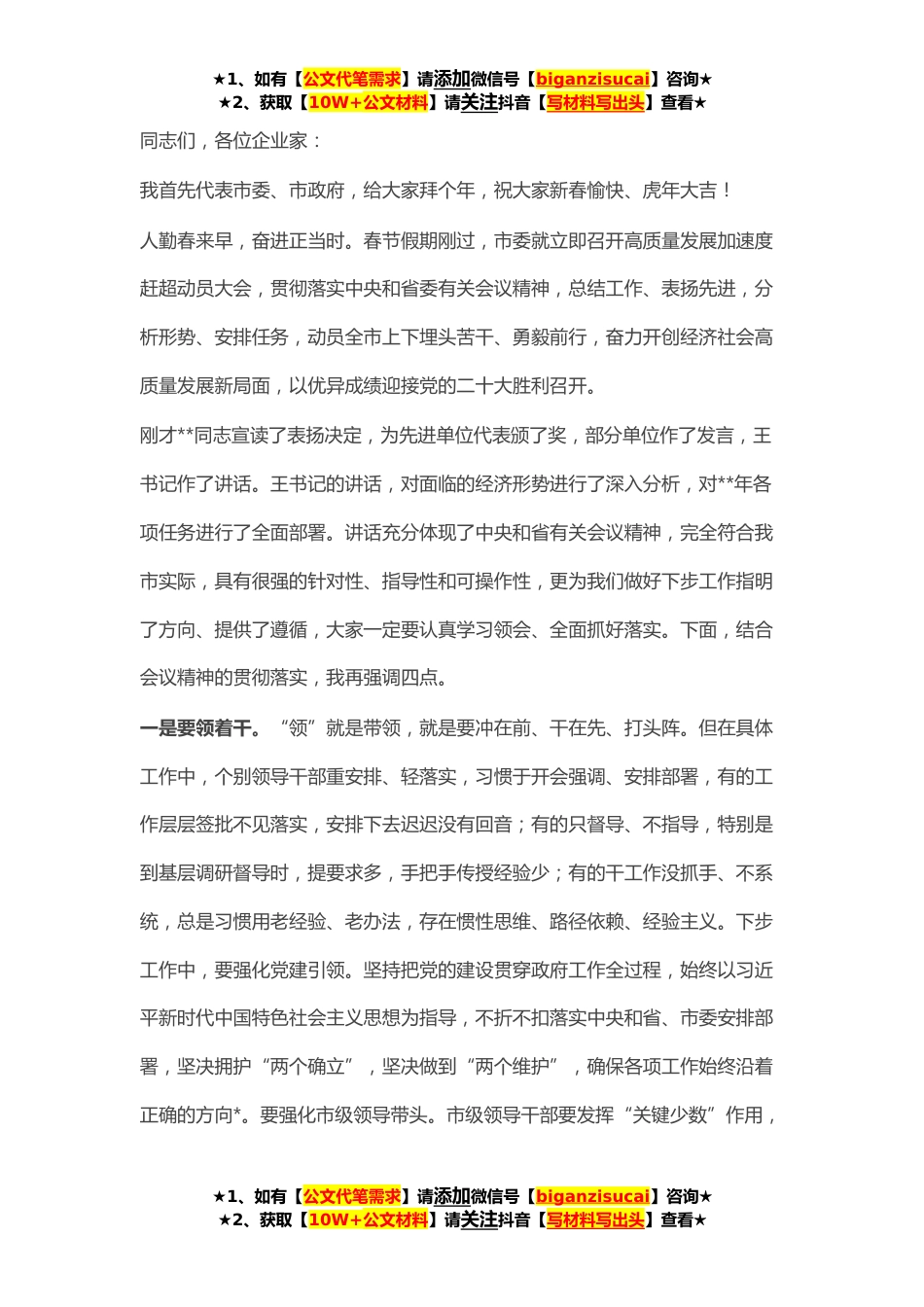 ★1、如有【公文代笔需求】请添加微信号【biganzisucai】咨询★★2、获取【10W+公文材料】请关注抖音【写材料写出头】查看★同志们,各位企业家:我首先代表市委、市政府,给大家拜个年,祝大家新春愉快、虎年大吉!人勤春来早,奋进正当时。春节假期刚过,市委就立即召开高质量发展加速度赶超动员大会,贯彻落实中央和省委有关会议精神,总结工作、表扬先进,分析形势、安排任务,动员全市上下埋头苦干、勇毅前行,奋力开创经济社会高质量发展新局面,以优异成绩迎接党的二十大胜利召开。刚才**同志宣读了表扬决定,为先进单位代表颁了奖,部分单位作了发言,王书记作了讲话。王书记的讲话,对面临的经济形势进行了深入分析,对**年各项任务进行了全面部署。讲话充分体现了中央和省有关会议精神,完全符合我市实...