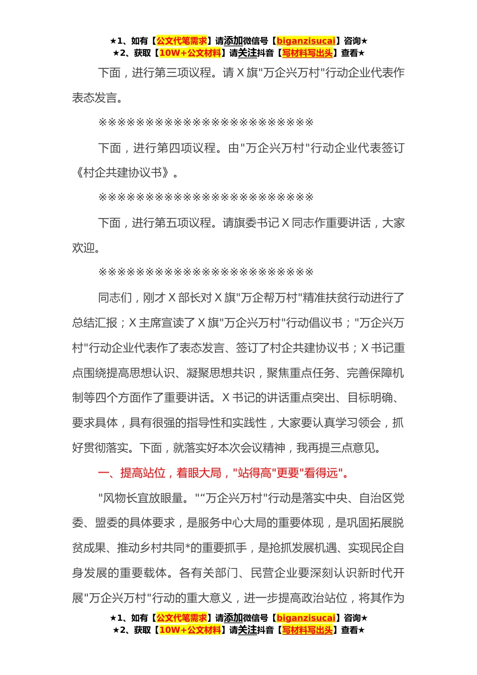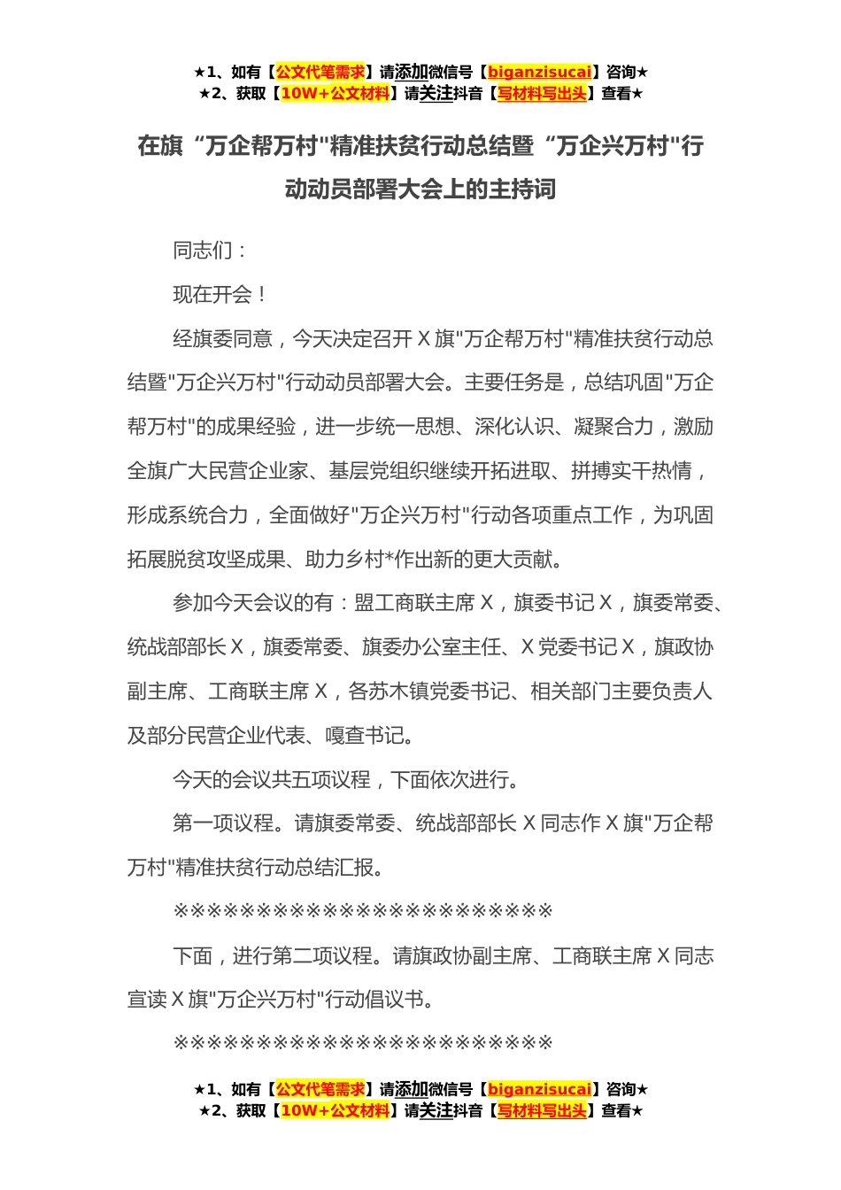 ★1、如有【公文代笔需求】请添加微信号【biganzisucai】咨询★★2、获取【10W+公文材料】请关注抖音【写材料写出头】查看★在旗“万企帮万村"精准扶贫行动总结暨“万企兴万村"行动动员部署大会上的主持词同志们:现在开会!经旗委同意,今天决定召开X旗"万企帮万村"精准扶贫行动总结暨"万企兴万村"行动动员部署大会。主要任务是,总结巩固"万企帮万村"的成果经验,进一步统一思想、深化认识、凝聚合力,激励全旗广大民营企业家、基层党组织继续开拓进取、拼搏实干热情,形成系统合力,全面做好"万企兴万村"行动各项重点工作,为巩固拓展脱贫攻坚成果、助力乡村*作出新的更大贡献。参加今天会议的有:盟工商联主席X,旗委书记X,旗委常委、统战部部长X,旗委常委、旗委办公室主任、X党委书记X,旗政协副主席、工商...