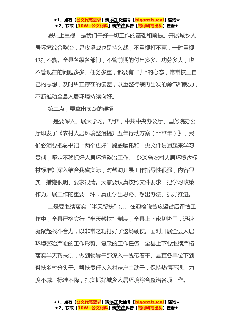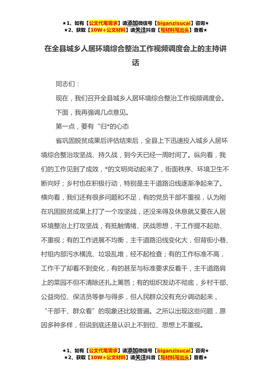★1、如有【公文代笔需求】请添加微信号【biganzisucai】咨询★★2、获取【10W+公文材料】请关注抖音【写材料写出头】查看★在全县城乡人居环境综合整治工作视频调度会上的主持讲话同志们:现在,我们召开全县城乡人居环境综合整治工作视频调度会。下面,我再强调几点意见。第一点,要有“归*的心态省巩固脱贫成果后评估结束后,全县上下迅速投入城乡人居环境综合整治攻坚战、持久战,到今天已经一周时间了。纵向看,我们的工作见到了成效,*的文明岗动起来了,街面秩序、环境卫生不断向好;乡村也在积极行动,特别是主干道路沿线逐渐净起来了。横向看,我们还有很多问题和不足,有的党员干部不重视,认为刚在巩固脱贫成果上打了一个攻坚战,还没来得及休息就又要在人居环境整治上打攻坚战,有抵触情绪、厌战思想...