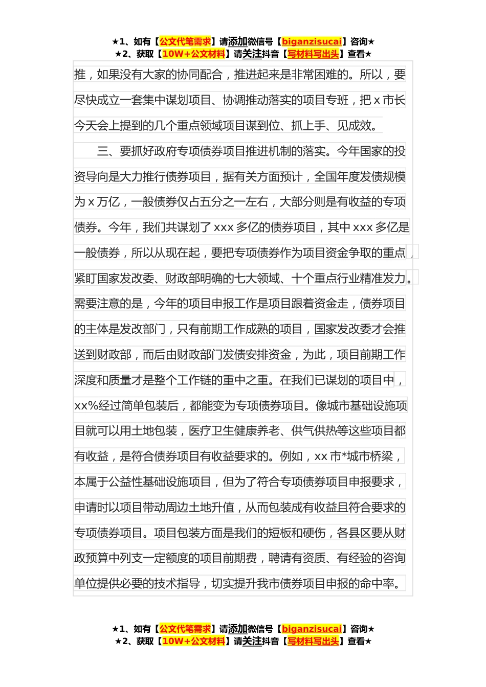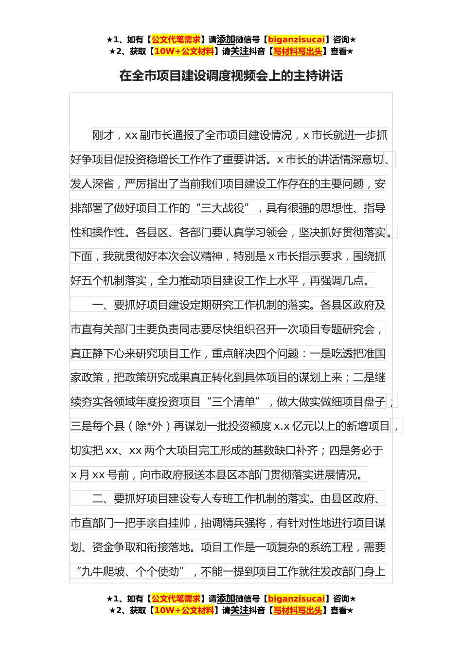 ★1、如有【公文代笔需求】请添加微信号【biganzisucai】咨询★★2、获取【10W+公文材料】请关注抖音【写材料写出头】查看★在全市项目建设调度视频会上的主持讲话刚才,xx副市长通报了全市项目建设情况,x市长就进一步抓好争项目促投资稳增长工作作了重要讲话。x市长的讲话情深意切、发人深省,严厉指出了当前我们项目建设工作存在的主要问题,安排部署了做好项目工作的“三大战役”,具有很强的思想性、指导性和操作性。各县区、各部门要认真学习领会,坚决抓好贯彻落实。下面,我就贯彻好本次会议精神,特别是x市长指示要求,围绕抓好五个机制落实,全力推动项目建设工作上水平,再强调几点。一、要抓好项目建设定期研究工作机制的落实。各县区政府及市直有关部门主要负责同志要尽快组织召开一次项目专题研究会...