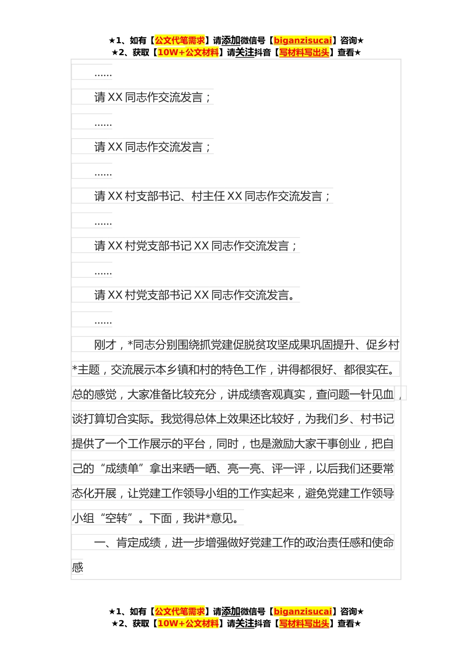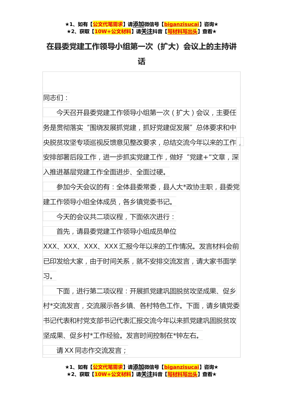 ★1、如有【公文代笔需求】请添加微信号【biganzisucai】咨询★★2、获取【10W+公文材料】请关注抖音【写材料写出头】查看★在县委党建工作领导小组第一次(扩大)会议上的主持讲话同志们:今天召开县委党建工作领导小组第一次(扩大)会议,主要任务是贯彻落实“围绕发展抓党建,抓好党建促发展”总体要求和中央脱贫攻坚专项巡视反馈意见整改要求,总结交流今年以来的工作,安排部署后段工作,进一步抓实党建工作,做好“党建+”文章,深入推进基层党建工作全面进步、全面过硬。参加今天会议的有:全体县委常委,县人大*政协主职,县委党建工作领导小组全体成员,各乡镇党委书记。今天的会议共二项议程,下面依次进行:首先,请县委党建工作领导小组成员单位XXX、XXX、XXX、XXX汇报今年以来的工作情况。发言材料...