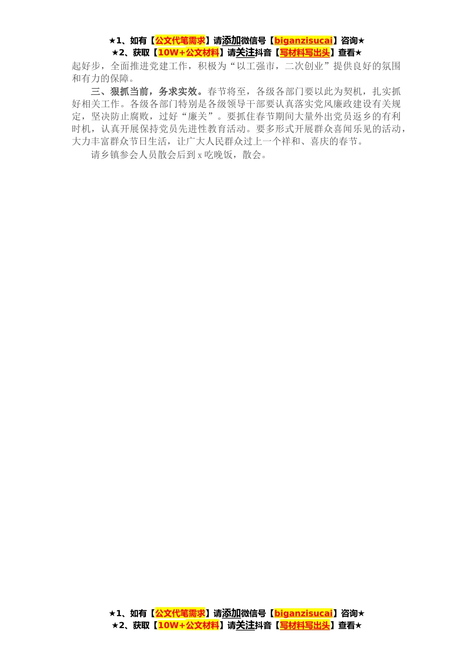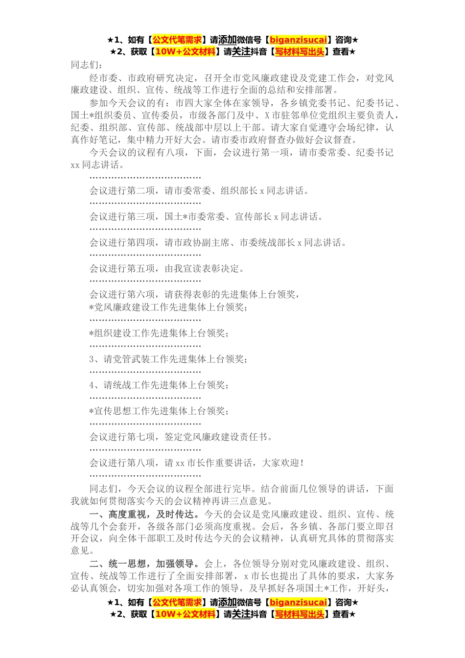 ★1、如有【公文代笔需求】请添加微信号【biganzisucai】咨询★★2、获取【10W+公文材料】请关注抖音【写材料写出头】查看★同志们:经市委、市政府研究决定,召开全市党风廉政建设及党建工作会,对党风廉政建设、组织、宣传、统战等工作进行全面的总结和安排部署。参加今天会议的有:市四大家全体在家领导,各乡镇党委书记、纪委书记、国土*组织委员、宣传委员,市级各部门及中、X市驻邻单位党组织主要负责人,纪委、组织部、宣传部、统战部中层以上干部。请大家自觉遵守会场纪律,认真作好笔记,集中精力开好大会。请市委市政府督查办做好会议督查。今天会议的议程有八项,下面,会议进行第一项,请市委常委、纪委书记xx同志讲话。………………………………会议进行第二项,请市委常委、组织部长x同志讲话。……...