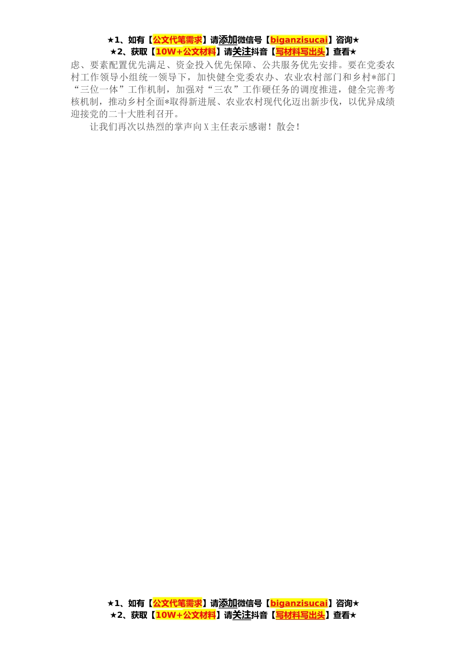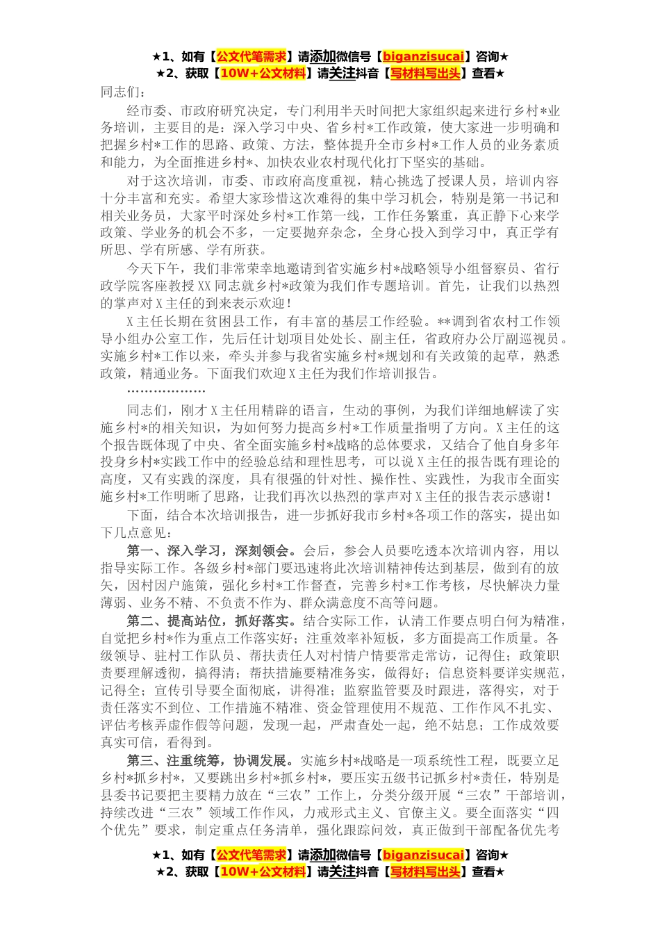 ★1、如有【公文代笔需求】请添加微信号【biganzisucai】咨询★★2、获取【10W+公文材料】请关注抖音【写材料写出头】查看★同志们:经市委、市政府研究决定,专门利用半天时间把大家组织起来进行乡村*业务培训,主要目的是:深入学习中央、省乡村*工作政策,使大家进一步明确和把握乡村*工作的思路、政策、方法,整体提升全市乡村*工作人员的业务素质和能力,为全面推进乡村*、加快农业农村现代化打下坚实的基础。对于这次培训,市委、市政府高度重视,精心挑选了授课人员,培训内容十分丰富和充实。希望大家珍惜这次难得的集中学习机会,特别是第一书记和相关业务员,大家平时深处乡村*工作第一线,工作任务繁重,真正静下心来学政策、学业务的机会不多,一定要抛弃杂念,全身心投入到学习中,真正学有所思、学...