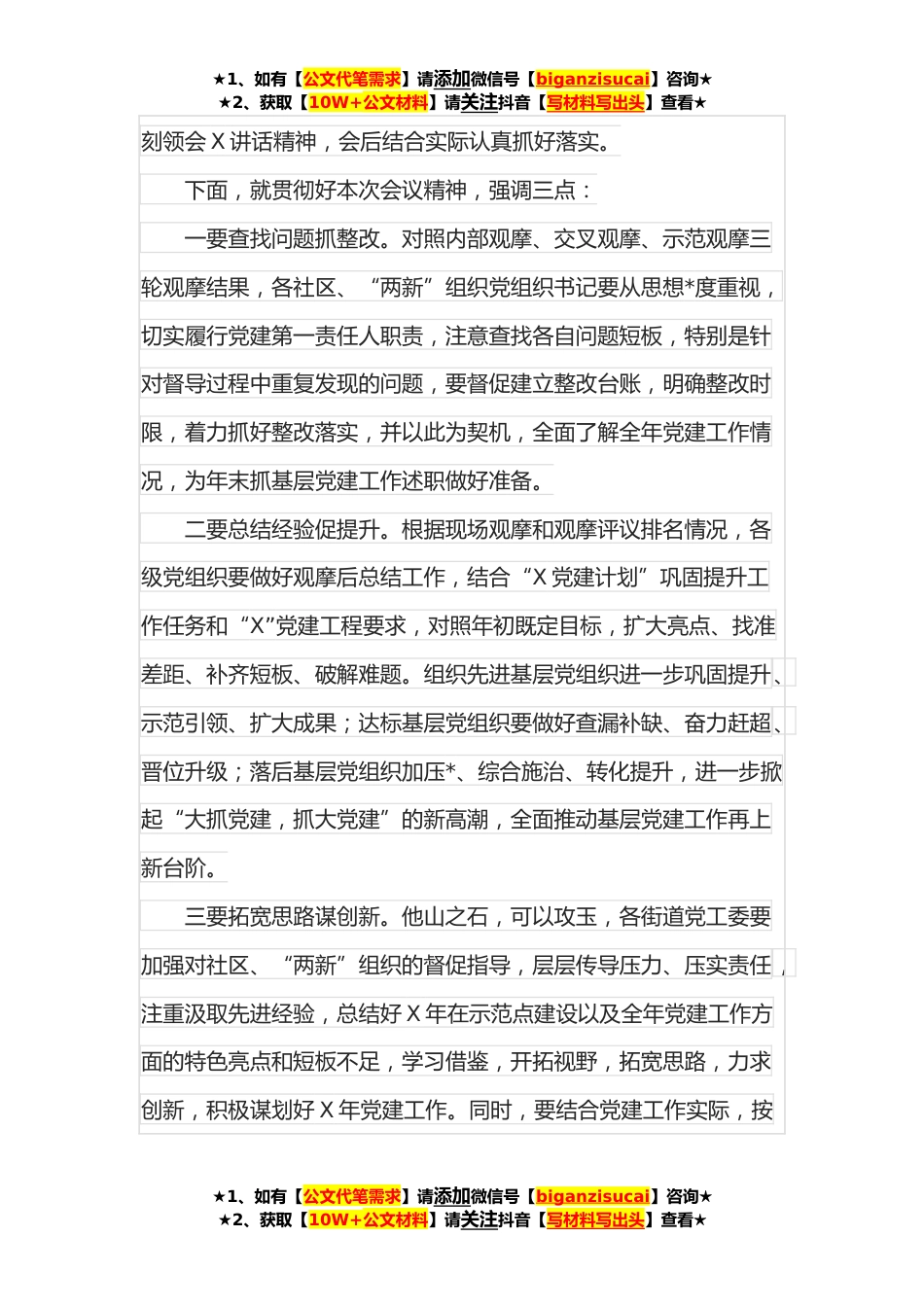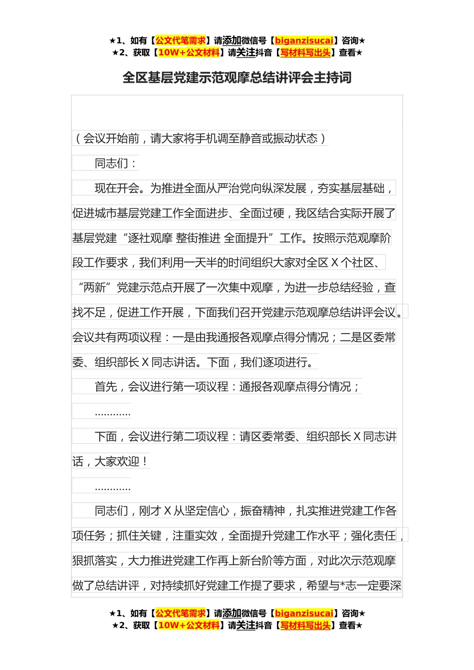 ★1、如有【公文代笔需求】请添加微信号【biganzisucai】咨询★★2、获取【10W+公文材料】请关注抖音【写材料写出头】查看★全区基层党建示范观摩总结讲评会主持词(会议开始前,请大家将手机调至静音或振动状态)同志们:现在开会。为推进全面从严治党向纵深发展,夯实基层基础,促进城市基层党建工作全面进步、全面过硬,我区结合实际开展了基层党建“逐社观摩整街推进全面提升”工作。按照示范观摩阶段工作要求,我们利用一天半的时间组织大家对全区X个社区、“两新”党建示范点开展了一次集中观摩,为进一步总结经验,查找不足,促进工作开展,下面我们召开党建示范观摩总结讲评会议。会议共有两项议程:一是由我通报各观摩点得分情况;二是区委常委、组织部长X同志讲话。下面,我们逐项进行。首先,会议进行...