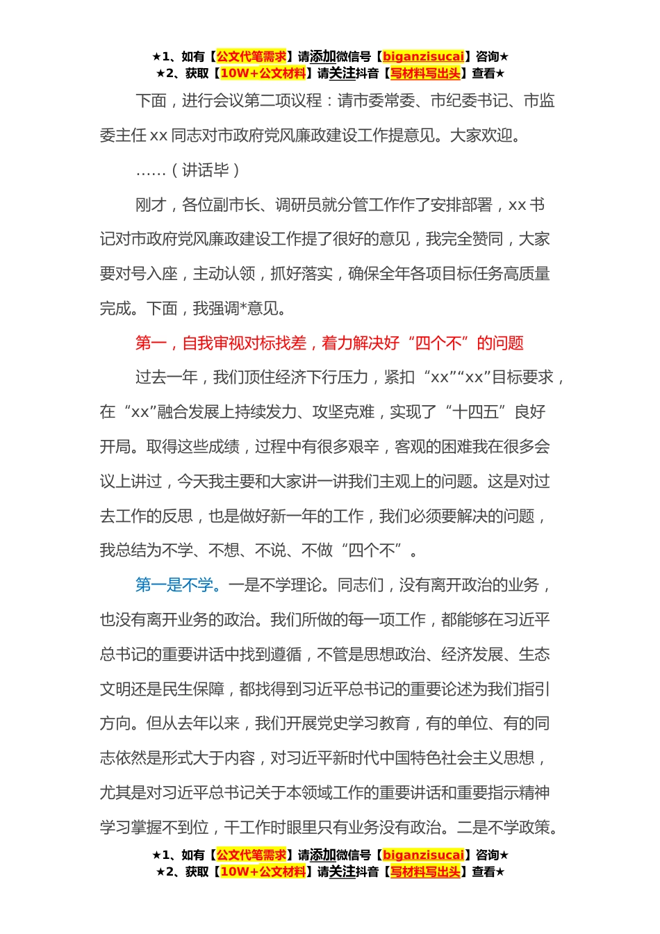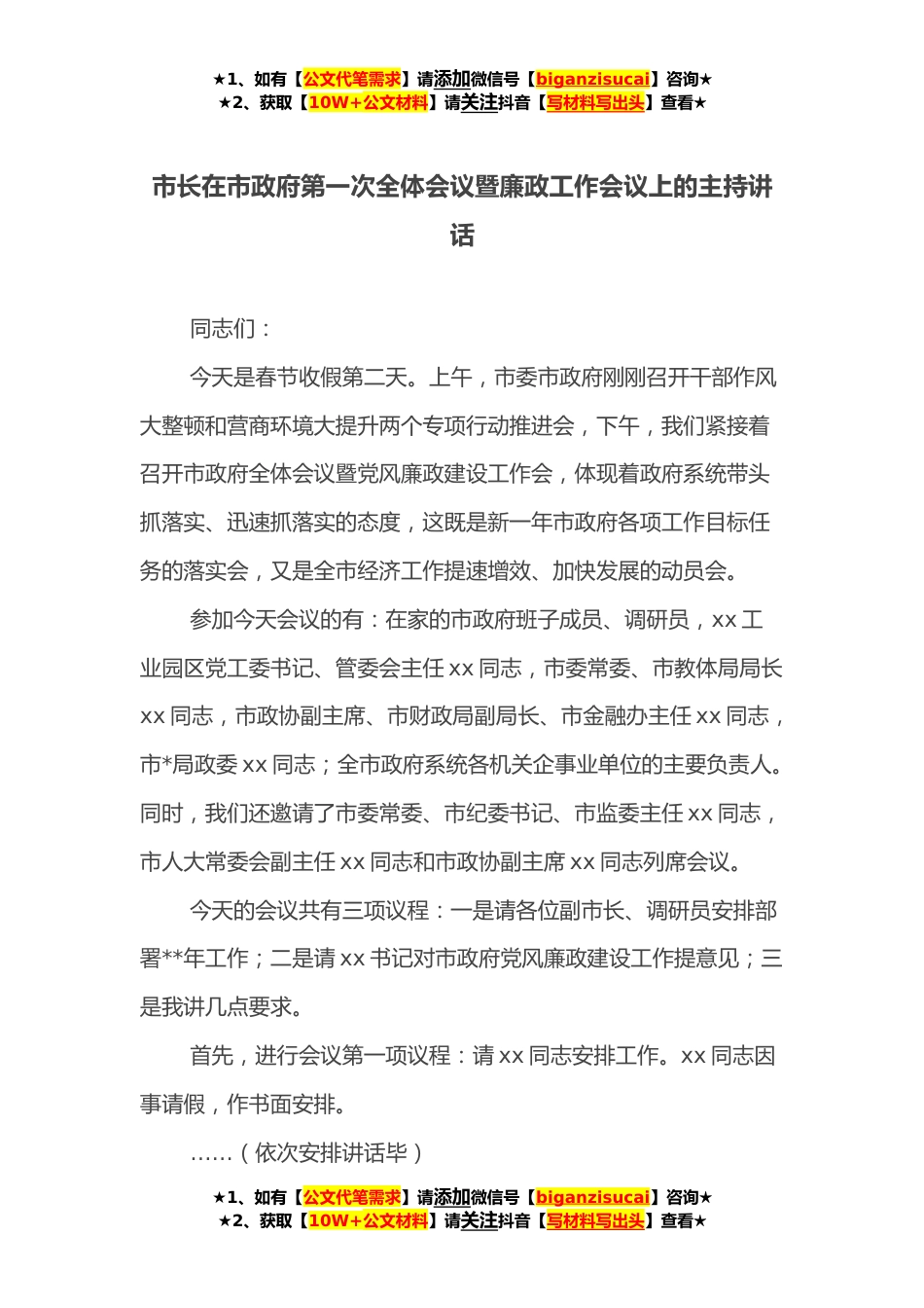 ★1、如有【公文代笔需求】请添加微信号【biganzisucai】咨询★★2、获取【10W+公文材料】请关注抖音【写材料写出头】查看★市长在市政府第一次全体会议暨廉政工作会议上的主持讲话同志们:今天是春节收假第二天。上午,市委市政府刚刚召开干部作风大整顿和营商环境大提升两个专项行动推进会,下午,我们紧接着召开市政府全体会议暨党风廉政建设工作会,体现着政府系统带头抓落实、迅速抓落实的态度,这既是新一年市政府各项工作目标任务的落实会,又是全市经济工作提速增效、加快发展的动员会。参加今天会议的有:在家的市政府班子成员、调研员,xx工业园区党工委书记、管委会主任xx同志,市委常委、市教体局局长xx同志,市政协副主席、市财政局副局长、市金融办主任xx同志,市*局政委xx同志;全市政府系统各机关...