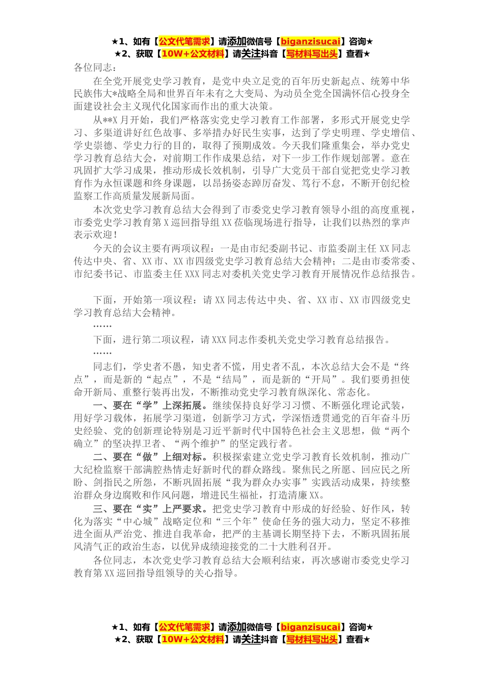 ★1、如有【公文代笔需求】请添加微信号【biganzisucai】咨询★★2、获取【10W+公文材料】请关注抖音【写材料写出头】查看★各位同志:在全党开展党史学习教育,是党中央立足党的百年历史新起点、统筹中华民族伟大*战略全局和世界百年未有之大变局、为动员全党全国满怀信心投身全面建设社会主义现代化国家而作出的重大决策。从**X月开始,我们严格落实党史学习教育工作部署,多形式开展党史学习、多渠道讲好红色故事、多举措办好民生实事,达到了学史明理、学史增信、学史崇德、学史力行的目的,取得了预期成效。今天我们隆重集会,举办党史学习教育总结大会,对前期工作作成果总结,对下一步工作作规划部署。意在巩固扩大学习成果,推动形成长效机制,引导广大党员干部自觉把党史学习教育作为永恒课题和终身课题...