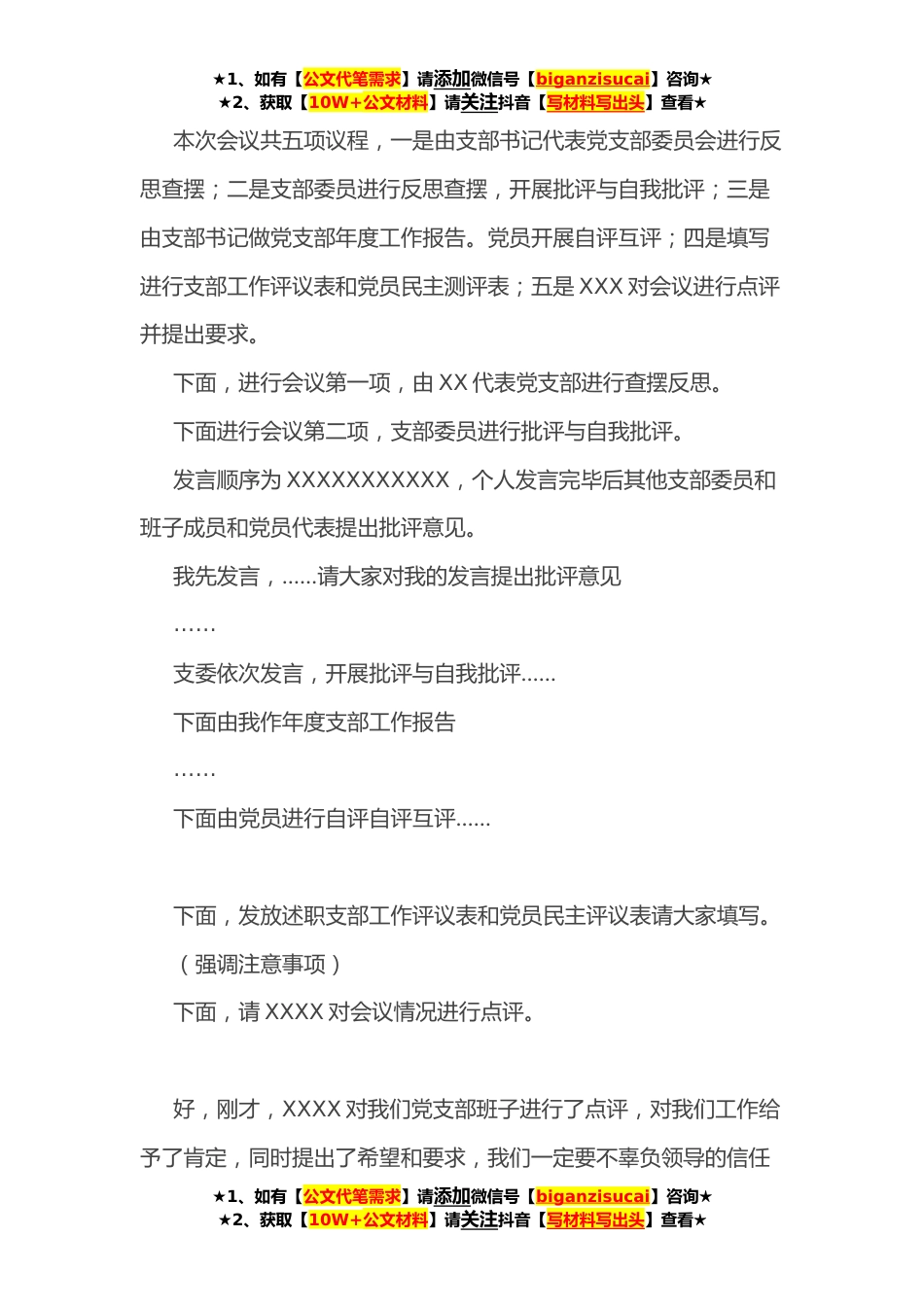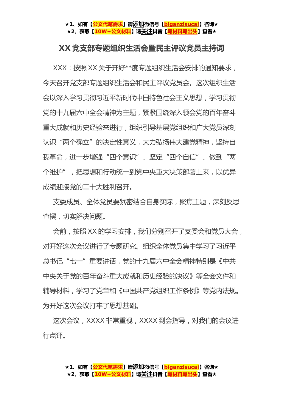 ★1、如有【公文代笔需求】请添加微信号【biganzisucai】咨询★★2、获取【10W+公文材料】请关注抖音【写材料写出头】查看★XX党支部专题组织生活会暨民主评议党员主持词XXX:按照XX关于开好**度专题组织生活会安排的通知要求,今天召开党支部专题组织生活会和民主评议党员会。这次组织生活会以深入学习贯彻习近平新时代中国特色社会主义思想,学习贯彻党的十九届六中全会精神为主题,紧紧围绕深入领会党的百年奋斗重大成就和历史经验来进行,组织引导基层党组织和广大党员深刻认识“两个确立”的决定性意义,大力弘扬伟大建党精神,坚持自我革命,进一步增强“四个意识”、坚定“四个自信”、做到“两个维护”,把思想和行动统一到党中央重大决策部署上来,以优异成绩迎接党的二十大胜利召开。支委成员、全体党员...