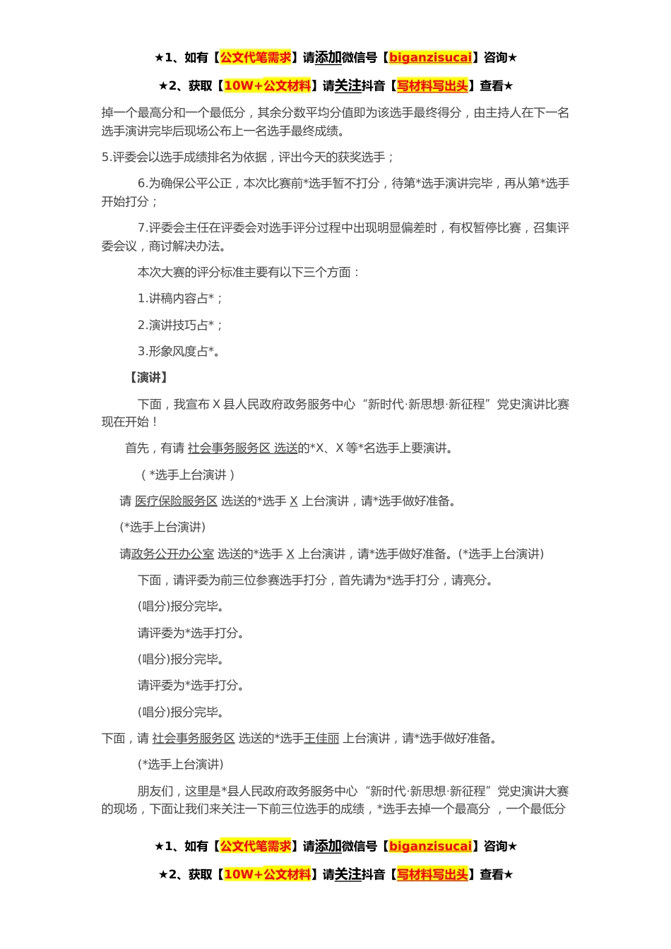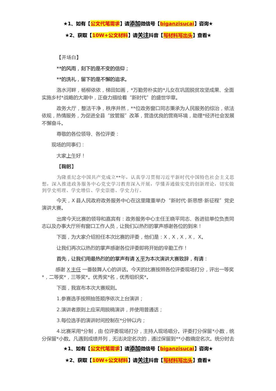 ★1、如有【公文代笔需求】请添加微信号【biganzisucai】咨询★★2、获取【10W+公文材料】请关注抖音【写材料写出头】查看★【开场白】**的风雨,刻下的是不变的信仰;**的洗礼,留下的是不懈的追求。洛水河畔,杨柳依依,梯田如画,*万勤劳朴实的*儿女在巩固脱贫攻坚成果、全面实施乡村*战略的大潮中,正奋力描绘着“新时代”的盛世华章。政务大厅,整洁干净,秩序井然,**位政务窗口同志秉承为人民服务的综治,依法依规,热情服务,为促进全县“放管服”改革,营造优良的营商环境,助理*经济社会发展不懈奋斗。尊敬的各位领导、各位评委:现场的同事们:大家上午好!【鞠躬】为隆重纪念中国共产党成立**年,认真学习贯彻习近平新时代中国特色社会主义思想,深入推进政务服务中心党史学习教育深入开展,学懂弄通...