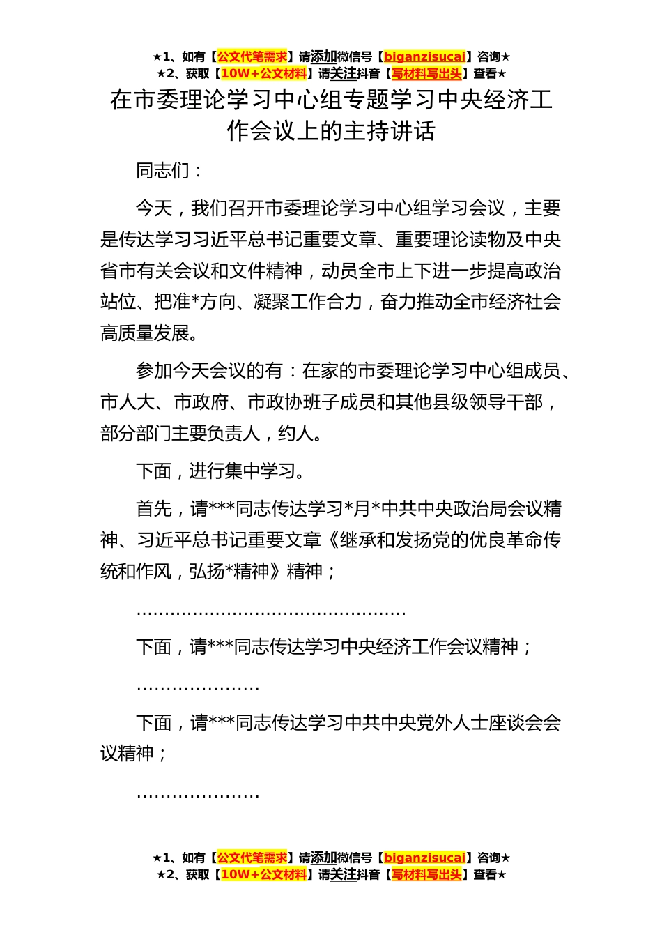 ★1、如有【公文代笔需求】请添加微信号【biganzisucai】咨询★★2、获取【10W+公文材料】请关注抖音【写材料写出头】查看★★1、如有【公文代笔需求】请添加微信号【biganzisucai】咨询★★2、获取【10W+公文材料】请关注抖音【写材料写出头】查看★★1、如有【公文代笔需求】请添加微信号【biganzisucai】咨询★★2、获取【10W+公文材料】请关注抖音【写材料写出头】查看★在市委理论学习中心组专题学习中央经济工作会议上的主持讲话同志们:今天,我们召开市委理论学习中心组学习会议,主要是传达学习习近平总书记重要文章、重要理论读物及中央省市有关会议和文件精神,动员全市上下进一步提高政治站位、把准*方向、凝聚工作合力,奋力推动全市经济社会高质量发展。参加今天会议的有:在家的市委理论学习中心组...