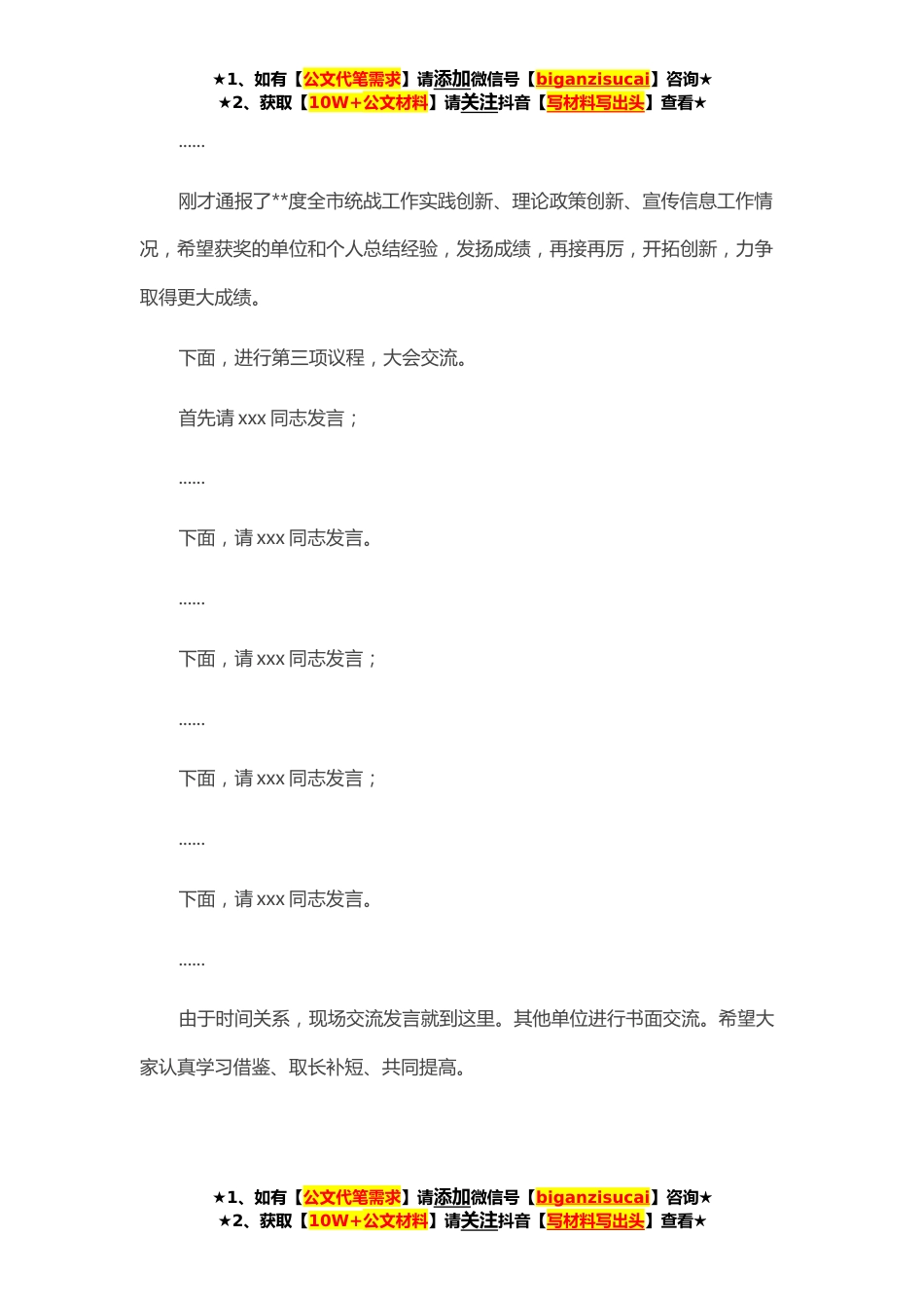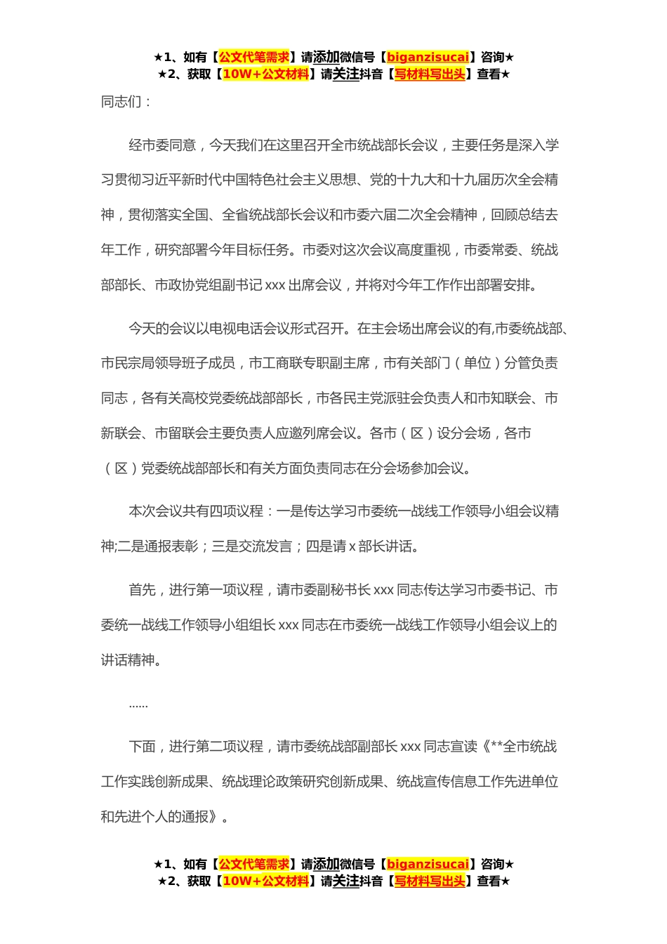 ★1、如有【公文代笔需求】请添加微信号【biganzisucai】咨询★★2、获取【10W+公文材料】请关注抖音【写材料写出头】查看★同志们:经市委同意,今天我们在这里召开全市统战部长会议,主要任务是深入学习贯彻习近平新时代中国特色社会主义思想、党的十九大和十九届历次全会精神,贯彻落实全国、全省统战部长会议和市委六届二次全会精神,回顾总结去年工作,研究部署今年目标任务。市委对这次会议高度重视,市委常委、统战部部长、市政协党组副书记xxx出席会议,并将对今年工作作出部署安排。今天的会议以电视电话会议形式召开。在主会场出席会议的有,市委统战部、市民宗局领导班子成员,市工商联专职副主席,市有关部门(单位)分管负责同志,各有关高校党委统战部部长,市各民主党派驻会负责人和市知联会、市新...