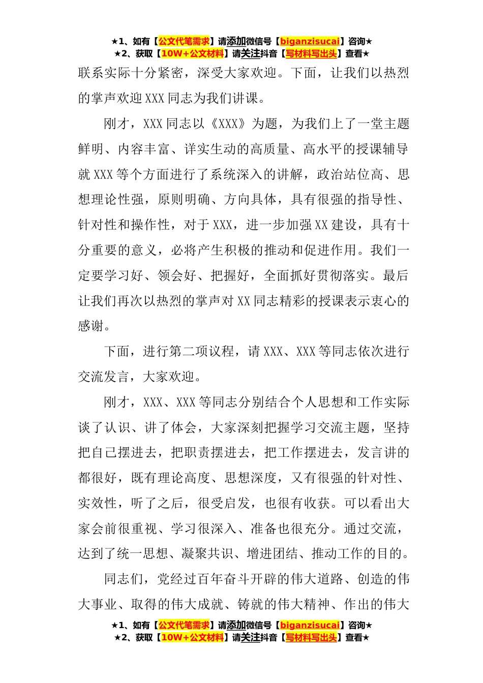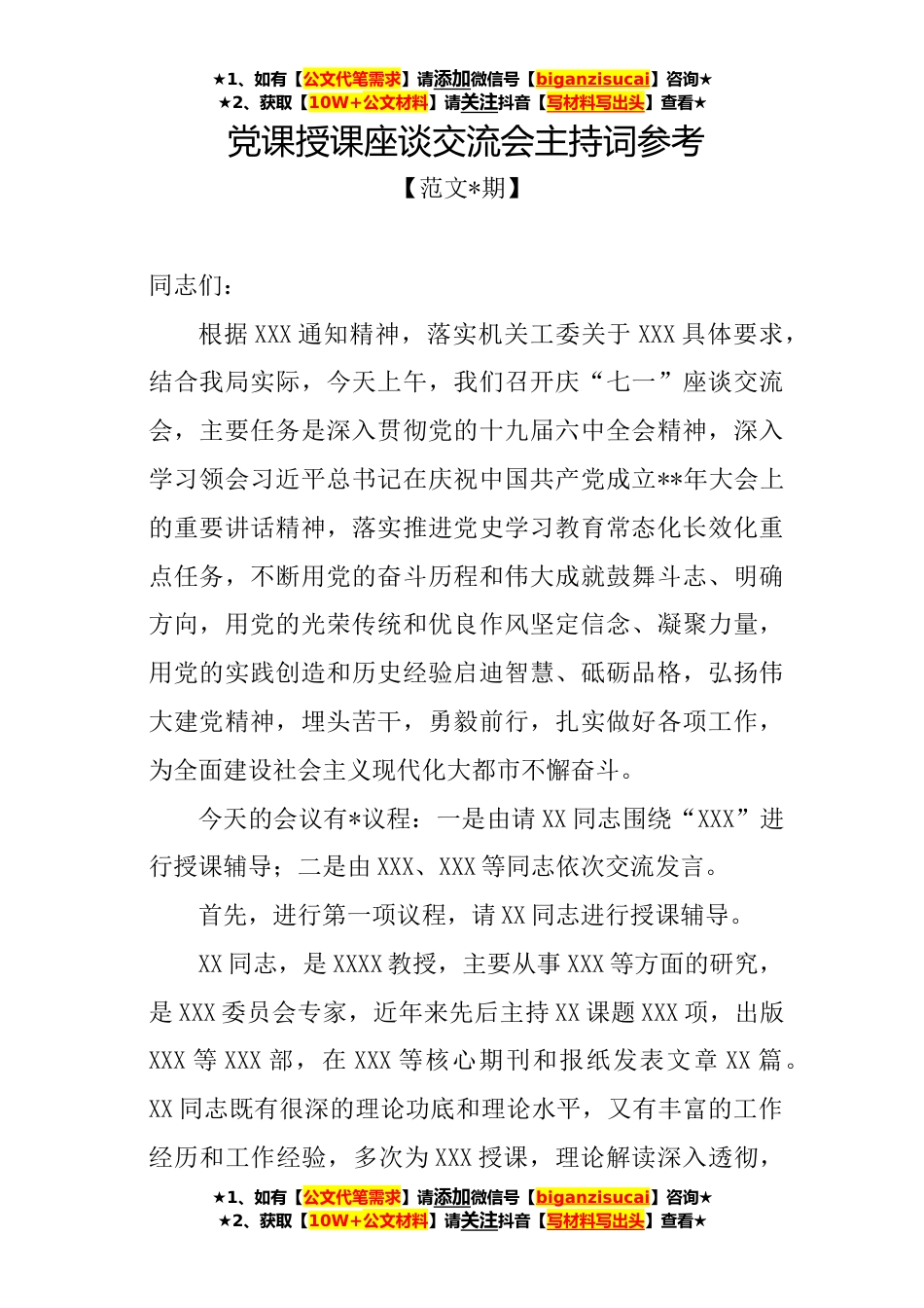 ★1、如有【公文代笔需求】请添加微信号【biganzisucai】咨询★★2、获取【10W+公文材料】请关注抖音【写材料写出头】查看★党课授课座谈交流会主持词参考【范文*期】同志们:根据XXX通知精神,落实机关工委关于XXX具体要求,结合我局实际,今天上午,我们召开庆“七一”座谈交流会,主要任务是深入贯彻党的十九届六中全会精神,深入学习领会习近平总书记在庆祝中国共产党成立**年大会上的重要讲话精神,落实推进党史学习教育常态化长效化重点任务,不断用党的奋斗历程和伟大成就鼓舞斗志、明确方向,用党的光荣传统和优良作风坚定信念、凝聚力量,用党的实践创造和历史经验启迪智慧、砥砺品格,弘扬伟大建党精神,埋头苦干,勇毅前行,扎实做好各项工作,为全面建设社会主义现代化大都市不懈奋斗。今天的会议有*...