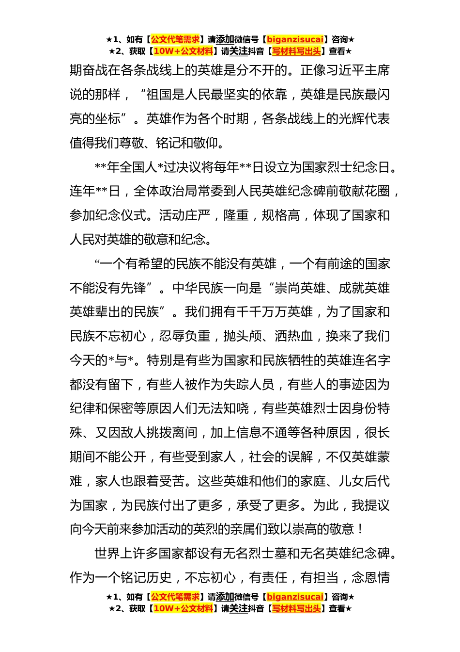 ★1、如有【公文代笔需求】请添加微信号【biganzisucai】咨询★★2、获取【10W+公文材料】请关注抖音【写材料写出头】查看★在*国无名英雄纪念仪式的主旨讲话颜建国各位烈士家人,各位嘉宾、各位代表,同志们、朋友们:大家好!在烈士纪念日和国庆节即将到来之即,我们在此举办*国无名英雄纪念活动,心情无比激动。在这里,我们要感谢英雄烈士后代们的信任,也要感谢主办方清华大学英雄文化基金的委托,由我们英雄儿女品牌联盟和大型音乐史诗《英雄组歌》组委会来承办本次纪念活动。我代表承办方所有工作人员对给予我们的信任与委托表示深深地谢意。首先,请允许我代表承办单位英雄儿女品牌联盟和大型音乐史诗《英雄组歌》组委会,向为国家独立,民族*而英勇献身的英雄们致以崇高的敬礼!特别要向由于各种原因而没...