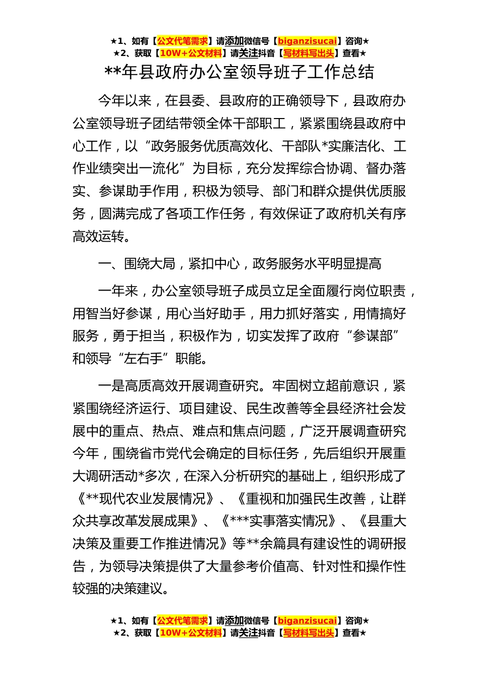 ★1、如有【公文代笔需求】请添加微信号【biganzisucai】咨询★★2、获取【10W+公文材料】请关注抖音【写材料写出头】查看★★1、如有【公文代笔需求】请添加微信号【biganzisucai】咨询★★2、获取【10W+公文材料】请关注抖音【写材料写出头】查看★★1、如有【公文代笔需求】请添加微信号【biganzisucai】咨询★★2、获取【10W+公文材料】请关注抖音【写材料写出头】查看★**年县政府办公室领导班子工作总结今年以来,在县委、县政府的正确领导下,县政府办公室领导班子团结带领全体干部职工,紧紧围绕县政府中心工作,以“政务服务优质高效化、干部队*实廉洁化、工作业绩突出一流化”为目标,充分发挥综合协调、督办落实、参谋助手作用,积极为领导、部门和群众提供优质服务,圆满完成了各项工作任务,有效保证...