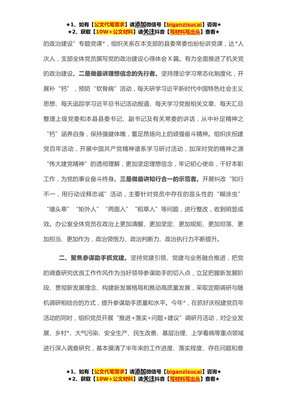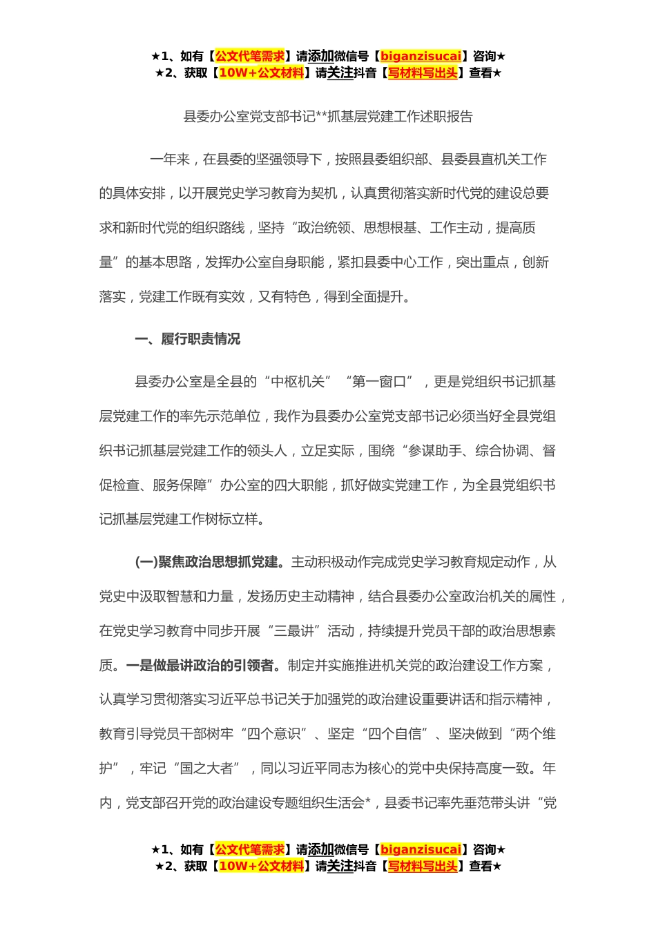 ★1、如有【公文代笔需求】请添加微信号【biganzisucai】咨询★★2、获取【10W+公文材料】请关注抖音【写材料写出头】查看★县委办公室党支部书记**抓基层党建工作述职报告一年来,在县委的坚强领导下,按照县委组织部、县委县直机关工作的具体安排,以开展党史学习教育为契机,认真贯彻落实新时代党的建设总要求和新时代党的组织路线,坚持“政治统领、思想根基、工作主动,提高质量”的基本思路,发挥办公室自身职能,紧扣县委中心工作,突出重点,创新落实,党建工作既有实效,又有特色,得到全面提升。一、履行职责情况县委办公室是全县的“中枢机关”“第一窗口”,更是党组织书记抓基层党建工作的率先示范单位,我作为县委办公室党支部书记必须当好全县党组织书记抓基层党建工作的领头人,立足实际,围绕“...
