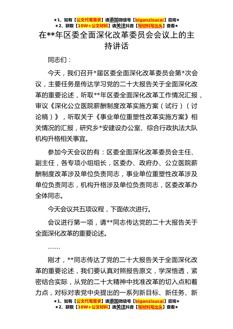 ★1、如有【公文代笔需求】请添加微信号【biganzisucai】咨询★★2、获取【10W+公文材料】请关注抖音【写材料写出头】查看★★1、如有【公文代笔需求】请添加微信号【biganzisucai】咨询★★2、获取【10W+公文材料】请关注抖音【写材料写出头】查看★★1、如有【公文代笔需求】请添加微信号【biganzisucai】咨询★★2、获取【10W+公文材料】请关注抖音【写材料写出头】查看★在**年区委全面深化改革委员会会议上的主持讲话同志们:今天,我们召开*届区委全面深化改革委员会第*次会议,主要任务是传达学习党的二十大报告关于全面深化改革的重要论述,听取**年区委全面深化改革工作情况汇报,审议《深化公立医院薪酬制度改革实施方案(试行)(讨论稿)》,听取关于《事业单位重塑性改革实施方案》相关情况的汇报,...
