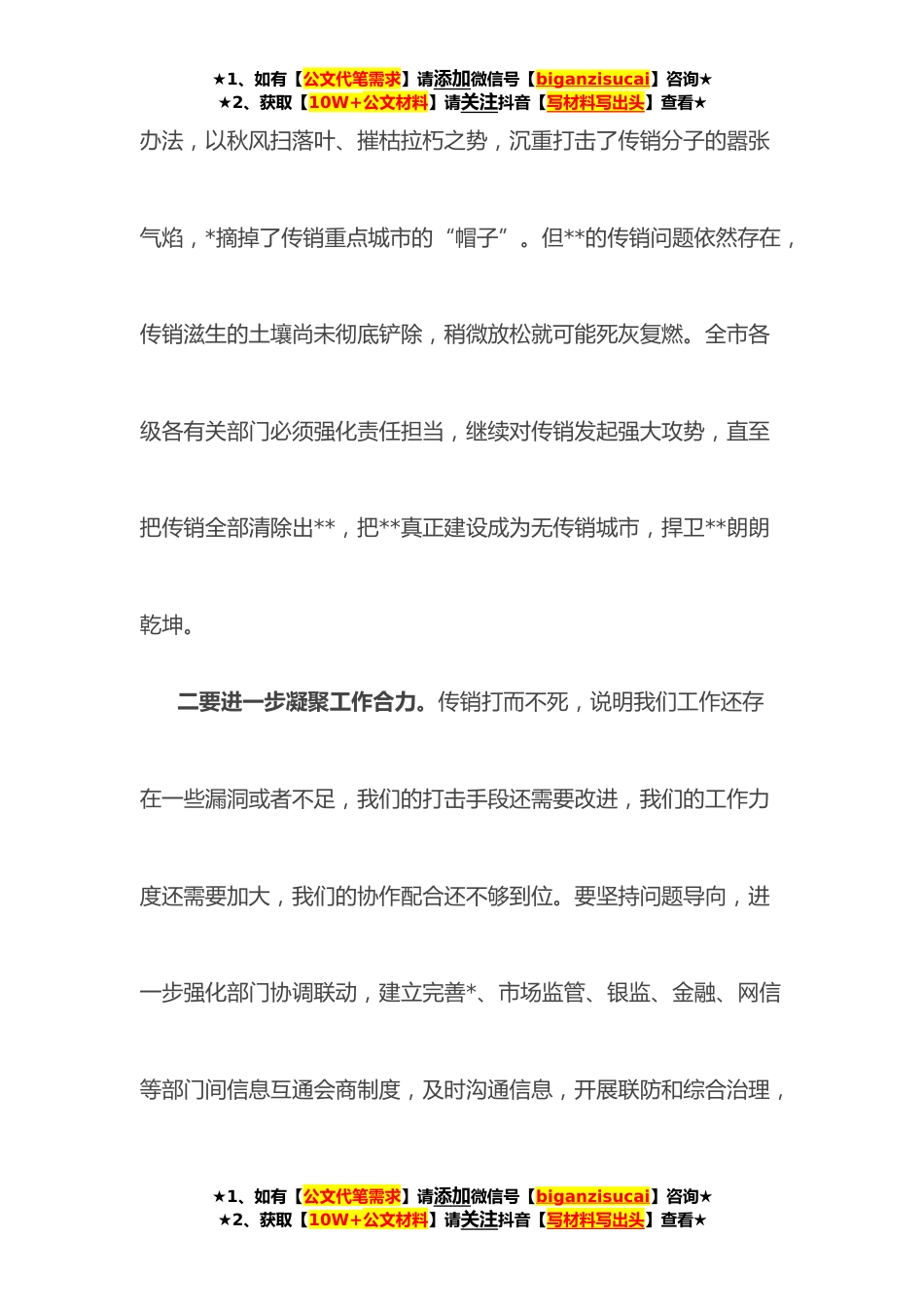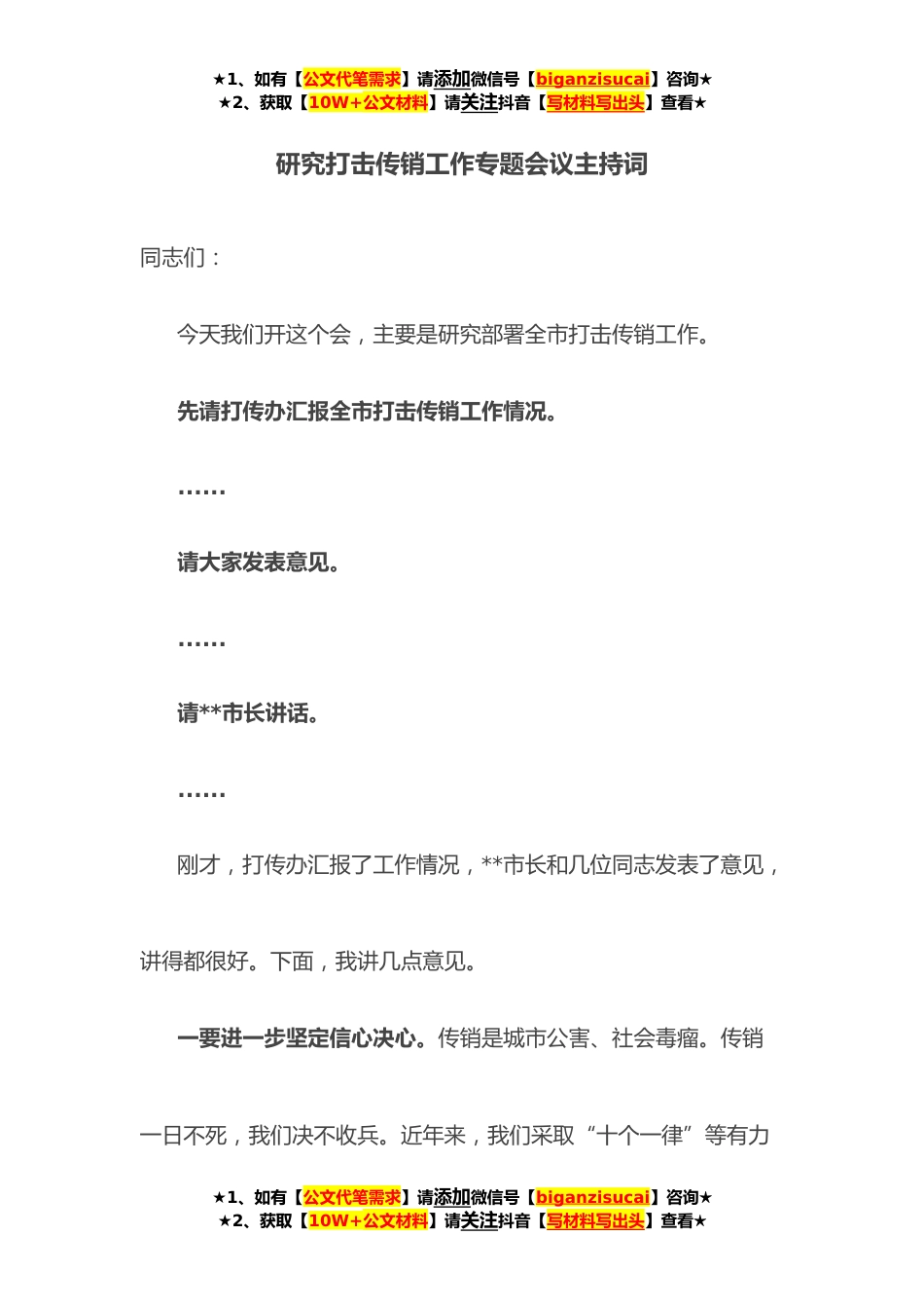 ★1、如有【公文代笔需求】请添加微信号【biganzisucai】咨询★★2、获取【10W+公文材料】请关注抖音【写材料写出头】查看★研究打击传销工作专题会议主持词同志们:今天我们开这个会,主要是研究部署全市打击传销工作。先请打传办汇报全市打击传销工作情况。......请大家发表意见。......请**市长讲话。......刚才,打传办汇报了工作情况,**市长和几位同志发表了意见,讲得都很好。下面,我讲几点意见。一要进一步坚定信心决心。传销是城市公害、社会毒瘤。传销一日不死,我们决不收兵。近年来,我们采取“十个一律”等有力★1、如有【公文代笔需求】请添加微信号【biganzisucai】咨询★★2、获取【10W+公文材料】请关注抖音【写材料写出头】查看★★1、如有【公文代笔需求】请添加微信号【biganzisucai】咨询★...