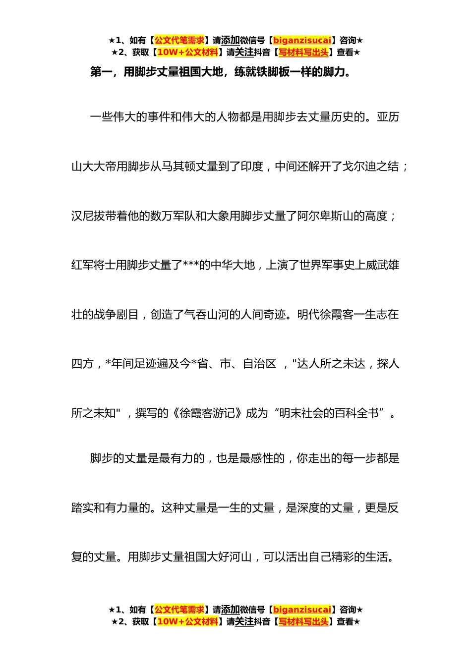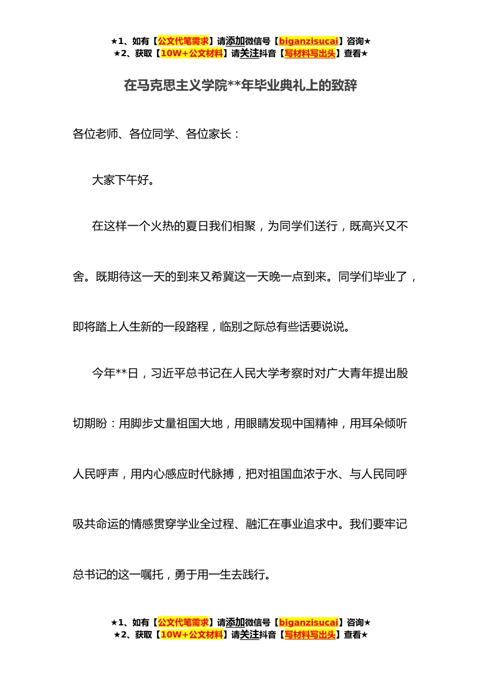 ★1、如有【公文代笔需求】请添加微信号【biganzisucai】咨询★★2、获取【10W+公文材料】请关注抖音【写材料写出头】查看★在马克思主义学院**年毕业典礼上的致辞各位老师、各位同学、各位家长:大家下午好。在这样一个火热的夏日我们相聚,为同学们送行,既高兴又不舍。既期待这一天的到来又希冀这一天晚一点到来。同学们毕业了,即将踏上人生新的一段路程,临别之际总有些话要说说。今年**日,习近平总书记在人民大学考察时对广大青年提出殷切期盼:用脚步丈量祖国大地,用眼睛发现中国精神,用耳朵倾听人民呼声,用内心感应时代脉搏,把对祖国血浓于水、与人民同呼吸共命运的情感贯穿学业全过程、融汇在事业追求中。我们要牢记总书记的这一嘱托,勇于用一生去践行。★1、如有【公文代笔需求】请添加微信号【bi...