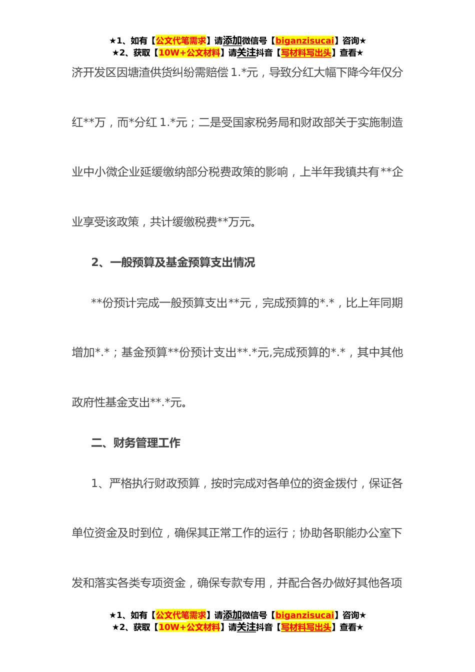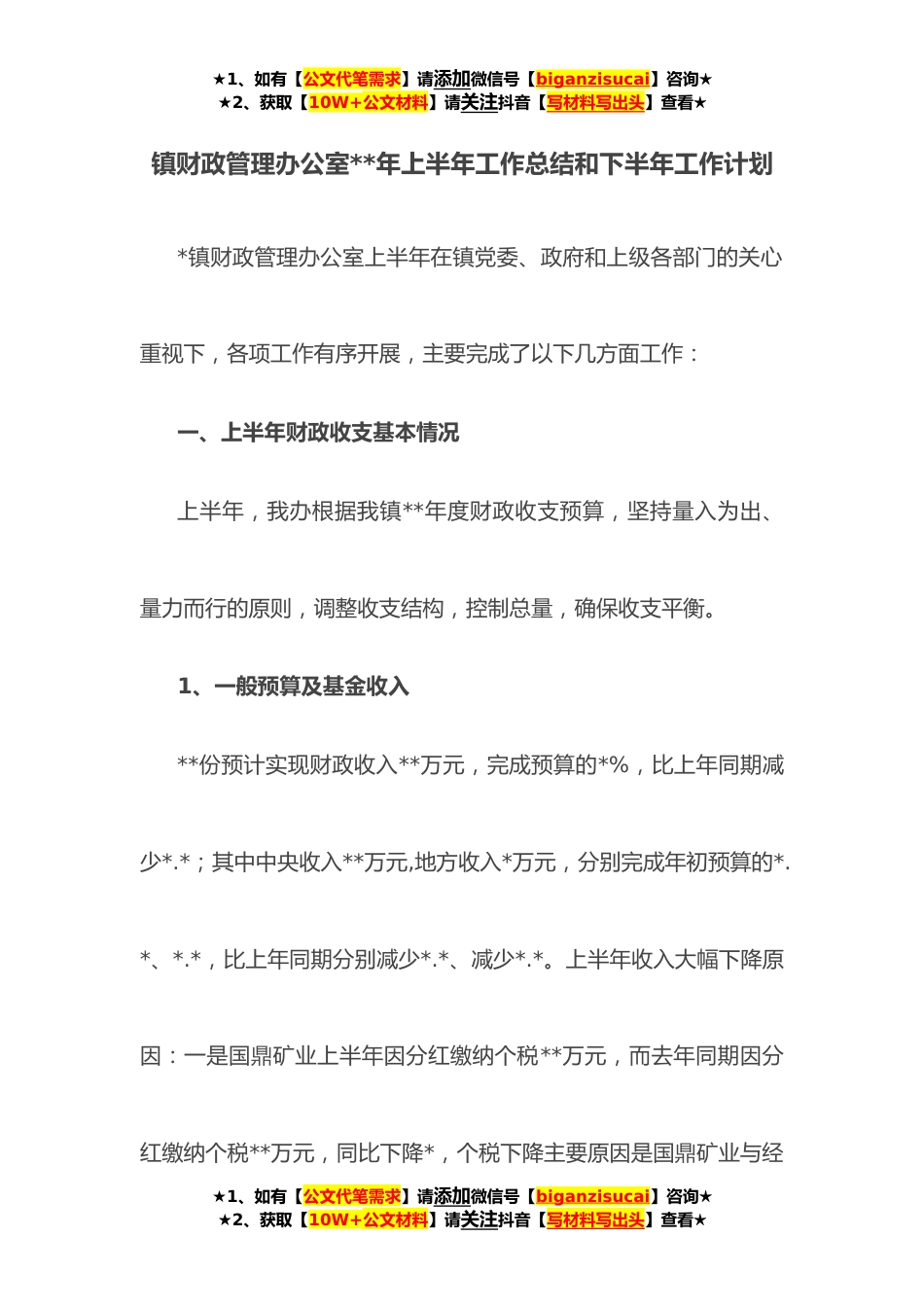 ★1、如有【公文代笔需求】请添加微信号【biganzisucai】咨询★★2、获取【10W+公文材料】请关注抖音【写材料写出头】查看★镇财政管理办公室**年上半年工作总结和下半年工作计划*镇财政管理办公室上半年在镇党委、政府和上级各部门的关心重视下,各项工作有序开展,主要完成了以下几方面工作:一、上半年财政收支基本情况上半年,我办根据我镇**年度财政收支预算,坚持量入为出、量力而行的原则,调整收支结构,控制总量,确保收支平衡。1、一般预算及基金收入**份预计实现财政收入**万元,完成预算的*%,比上年同期减少*.*;其中中央收入**万元,地方收入*万元,分别完成年初预算的*.*、*.*,比上年同期分别减少*.*、减少*.*。上半年收入大幅下降原因:一是国鼎矿业上半年因分红缴纳个税**万元,而去年同期因分红...