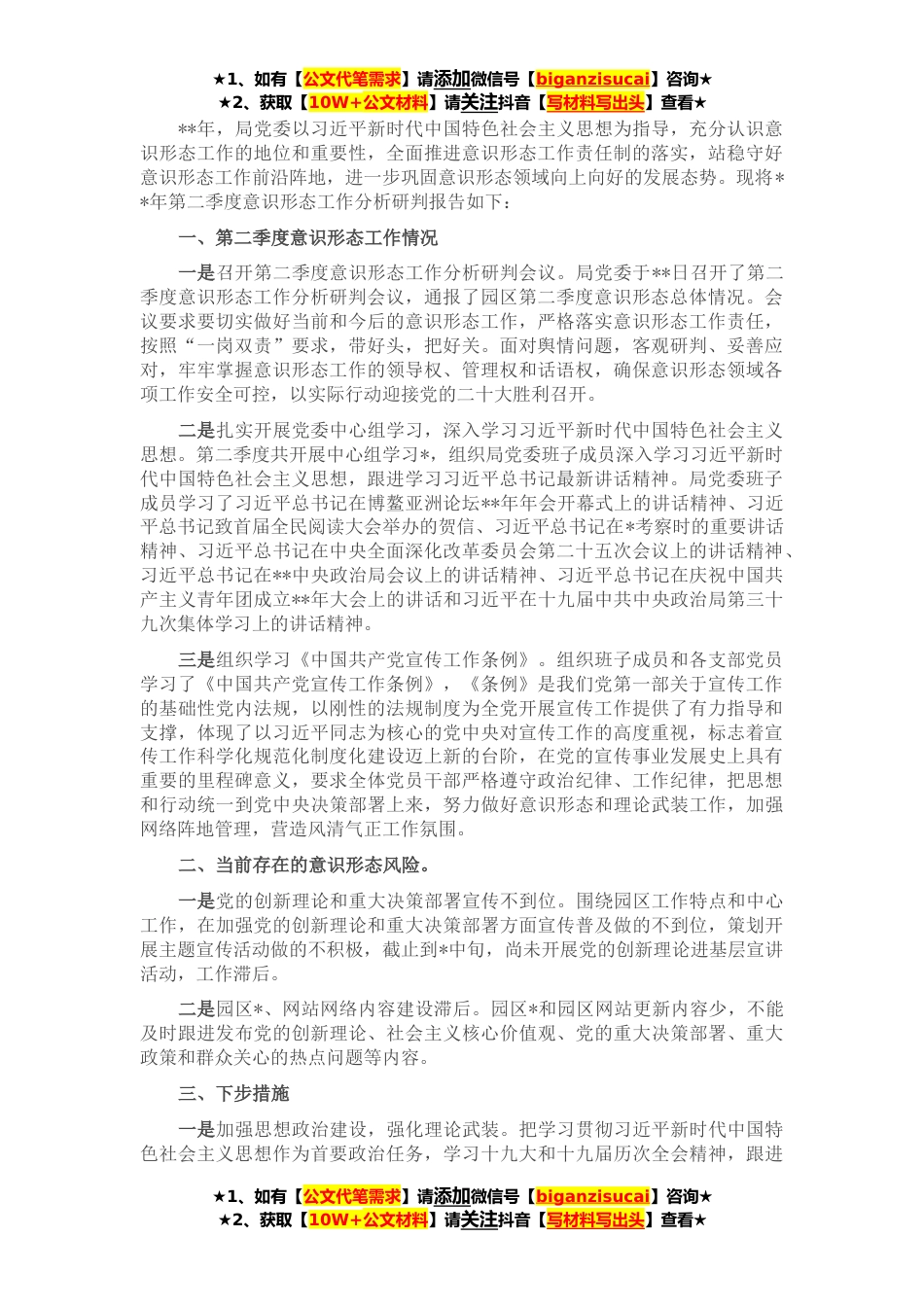 ★1、如有【公文代笔需求】请添加微信号【biganzisucai】咨询★★2、获取【10W+公文材料】请关注抖音【写材料写出头】查看★**年,局党委以习近平新时代中国特色社会主义思想为指导,充分认识意识形态工作的地位和重要性,全面推进意识形态工作责任制的落实,站稳守好意识形态工作前沿阵地,进一步巩固意识形态领域向上向好的发展态势。现将**年第二季度意识形态工作分析研判报告如下:一、第二季度意识形态工作情况一是召开第二季度意识形态工作分析研判会议。局党委于**日召开了第二季度意识形态工作分析研判会议,通报了园区第二季度意识形态总体情况。会议要求要切实做好当前和今后的意识形态工作,严格落实意识形态工作责任,按照“一岗双责”要求,带好头,把好关。面对舆情问题,客观研判、妥善应对,牢牢...