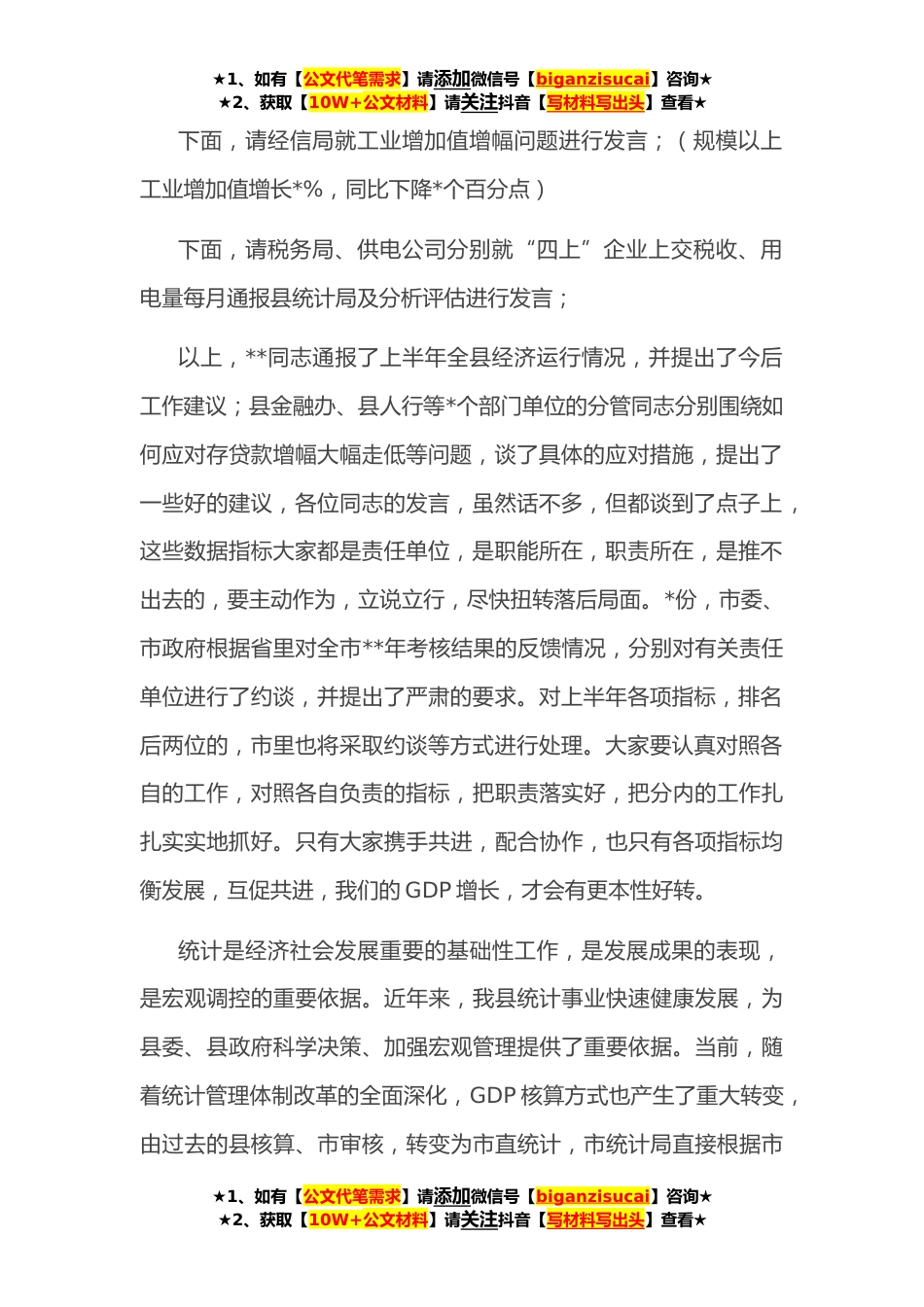★1、如有【公文代笔需求】请添加微信号【biganzisucai】咨询★★2、获取【10W+公文材料】请关注抖音【写材料写出头】查看★在**年第二次统计工作联席会议上的主持讲话同志们:上半年各项数据已经出来。今天,我们在这里召开第二次全县统计工作联席会议,主要目的是,对上半年经济社会发展的各项数据进行分析比较,找出弱势指标、拖后腿的指标,进一步动员各级各部门发挥主观能动性,努力抓好各行各业的指标入统工作,全面客观地反映我县经济社会发展情况。下面,请统计局**同志通报上半年全县经济运行情况;下面,请县金融办、县人行分别就如何应对存贷款增幅大幅走低问题进行发言;(全县金融机构本外币存款余额***亿元,较年初增加**亿元,增长**%;本外币贷款余额***亿元,较年初减少***亿元,增长**%)下面,...