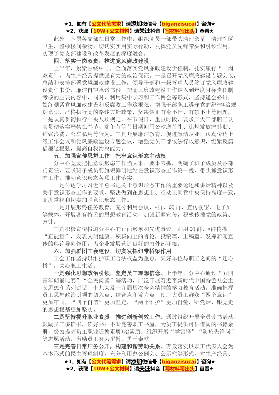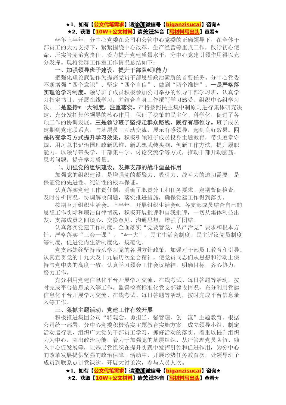 ★1、如有【公文代笔需求】请添加微信号【biganzisucai】咨询★★2、获取【10W+公文材料】请关注抖音【写材料写出头】查看★**年上半年,分中心党委在公司和公管中心党委的正确领导下,在全体干部员工的大力支持下,紧紧围绕中心改革、生产经营等重点工作,践行初心使命,压实管党治党责任,着力提升党建质量水平,分中心党建引领作用得以充分发挥。现将党群工作室工作情况总结如下:一、加强领导班子建设,提升干部队*职能力把强化理论武装作为提高党员干部思想政治素质的首要任务。分中心党委不断增强“四个意识”、坚定“四个自信”、做到“两个维护”。一是严格落实理论学习制度。领导班子成员积极参加公司举办的领导干部学习班,认真学习指定书目,开展在线学习,并结合自身工作撰写学习感受。组织中心组学习...