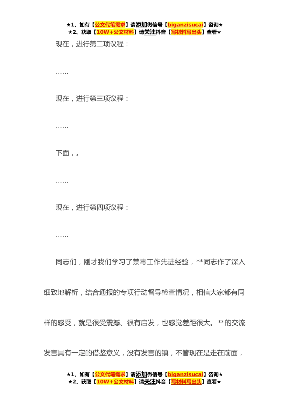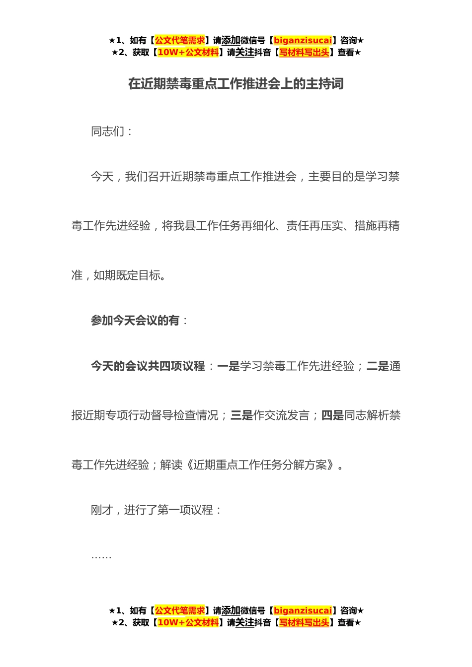 ★1、如有【公文代笔需求】请添加微信号【biganzisucai】咨询★★2、获取【10W+公文材料】请关注抖音【写材料写出头】查看★在近期禁毒重点工作推进会上的主持词同志们:今天,我们召开近期禁毒重点工作推进会,主要目的是学习禁毒工作先进经验,将我县工作任务再细化、责任再压实、措施再精准,如期既定目标。参加今天会议的有:今天的会议共四项议程:一是学习禁毒工作先进经验;二是通报近期专项行动督导检查情况;三是作交流发言;四是同志解析禁毒工作先进经验;解读《近期重点工作任务分解方案》。刚才,进行了第一项议程:......★1、如有【公文代笔需求】请添加微信号【biganzisucai】咨询★★2、获取【10W+公文材料】请关注抖音【写材料写出头】查看★★1、如有【公文代笔需求】请添加微信号【biganzisuc...