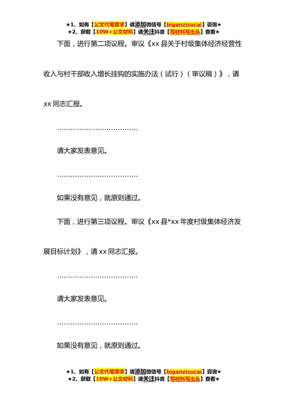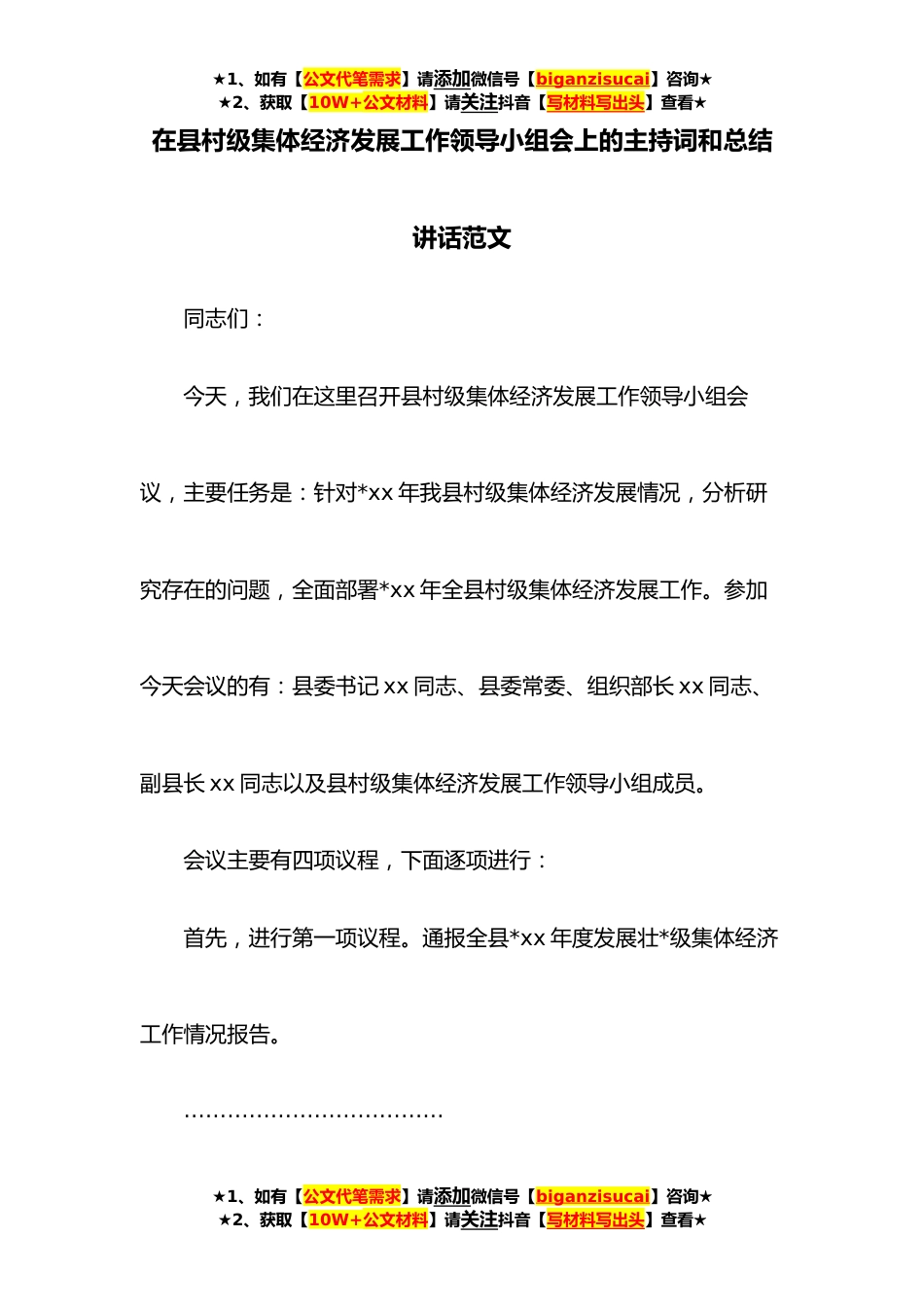 ★1、如有【公文代笔需求】请添加微信号【biganzisucai】咨询★★2、获取【10W+公文材料】请关注抖音【写材料写出头】查看★在县村级集体经济发展工作领导小组会上的主持词和总结讲话范文同志们:今天,我们在这里召开县村级集体经济发展工作领导小组会议,主要任务是:针对*xx年我县村级集体经济发展情况,分析研究存在的问题,全面部署*xx年全县村级集体经济发展工作。参加今天会议的有:县委书记xx同志、县委常委、组织部长xx同志、副县长xx同志以及县村级集体经济发展工作领导小组成员。会议主要有四项议程,下面逐项进行:首先,进行第一项议程。通报全县*xx年度发展壮*级集体经济工作情况报告。………………………………★1、如有【公文代笔需求】请添加微信号【biganzisucai】咨询★★2、获取【10W+公文材...