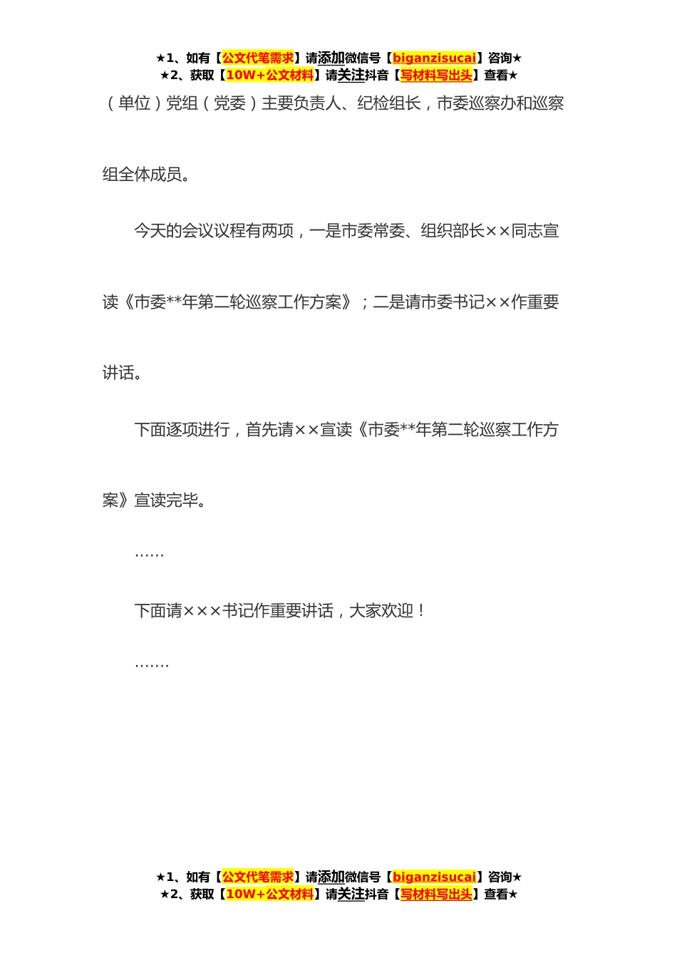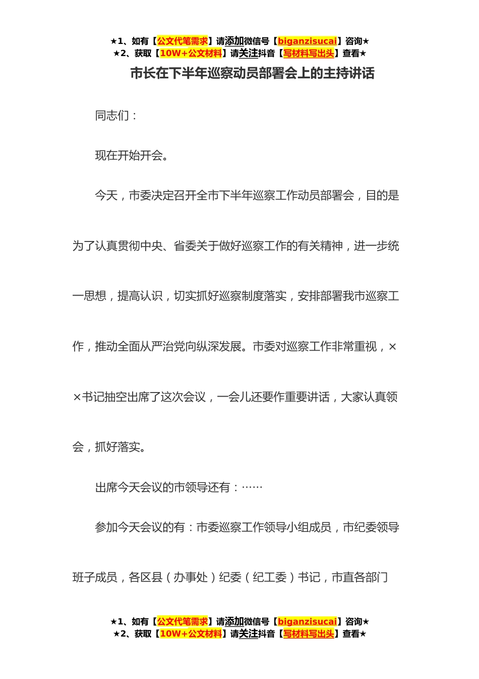 ★1、如有【公文代笔需求】请添加微信号【biganzisucai】咨询★★2、获取【10W+公文材料】请关注抖音【写材料写出头】查看★市长在下半年巡察动员部署会上的主持讲话同志们:现在开始开会。今天,市委决定召开全市下半年巡察工作动员部署会,目的是为了认真贯彻中央、省委关于做好巡察工作的有关精神,进一步统一思想,提高认识,切实抓好巡察制度落实,安排部署我市巡察工作,推动全面从严治党向纵深发展。市委对巡察工作非常重视,××书记抽空出席了这次会议,一会儿还要作重要讲话,大家认真领会,抓好落实。出席今天会议的市领导还有:······参加今天会议的有:市委巡察工作领导小组成员,市纪委领导班子成员,各区县(办事处)纪委(纪工委)书记,市直各部门★1、如有【公文代笔需求】请添加微信号【...