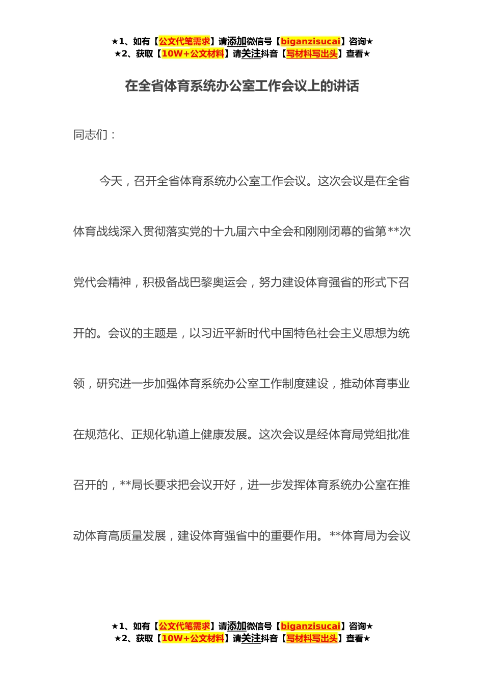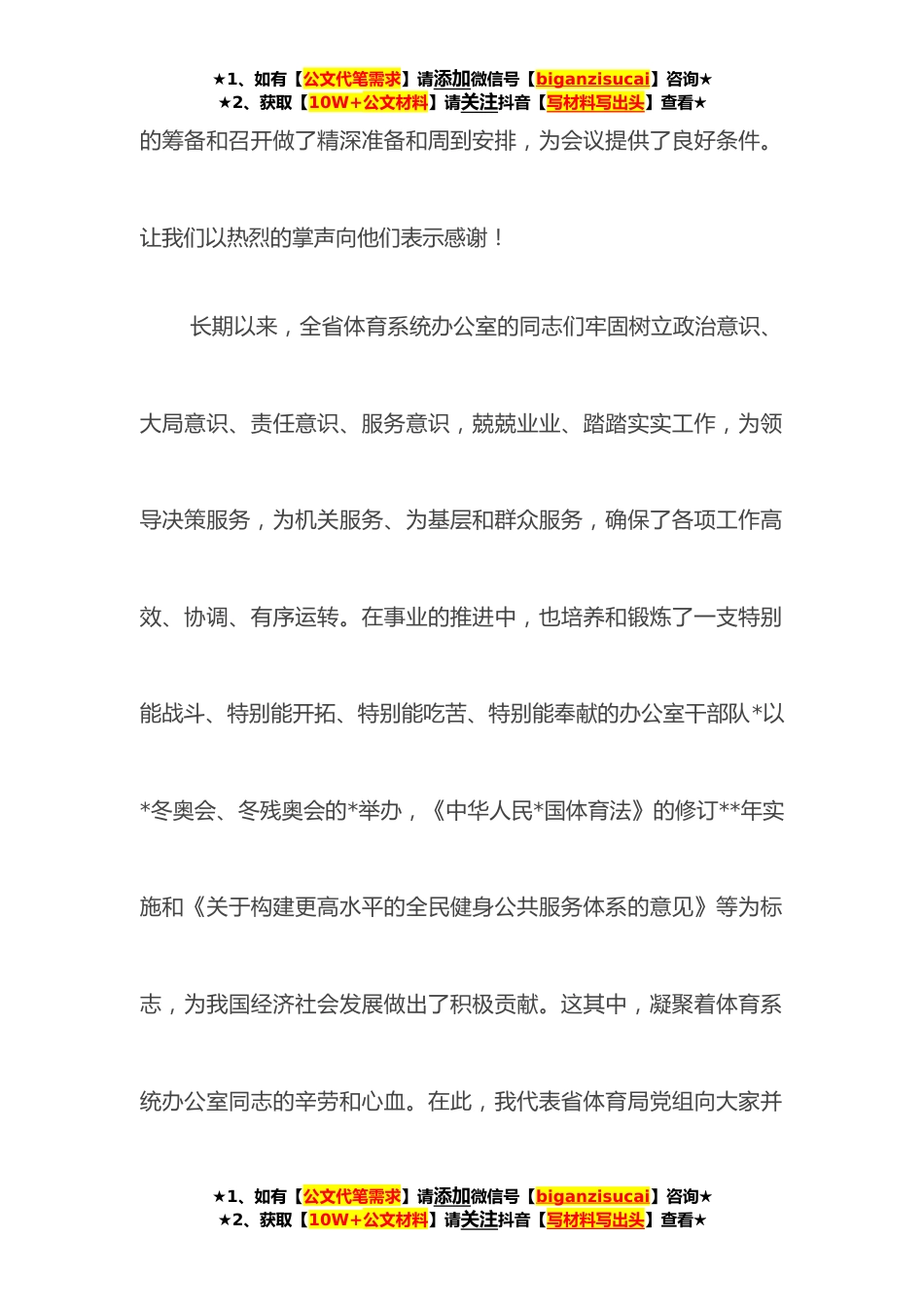★1、如有【公文代笔需求】请添加微信号【biganzisucai】咨询★★2、获取【10W+公文材料】请关注抖音【写材料写出头】查看★在全省体育系统办公室工作会议上的讲话同志们:今天,召开全省体育系统办公室工作会议。这次会议是在全省体育战线深入贯彻落实党的十九届六中全会和刚刚闭幕的省第**次党代会精神,积极备战巴黎奥运会,努力建设体育强省的形式下召开的。会议的主题是,以习近平新时代中国特色社会主义思想为统领,研究进一步加强体育系统办公室工作制度建设,推动体育事业在规范化、正规化轨道上健康发展。这次会议是经体育局党组批准召开的,**局长要求把会议开好,进一步发挥体育系统办公室在推动体育高质量发展,建设体育强省中的重要作用。**体育局为会议★1、如有【公文代笔需求】请添加微信号【biga...