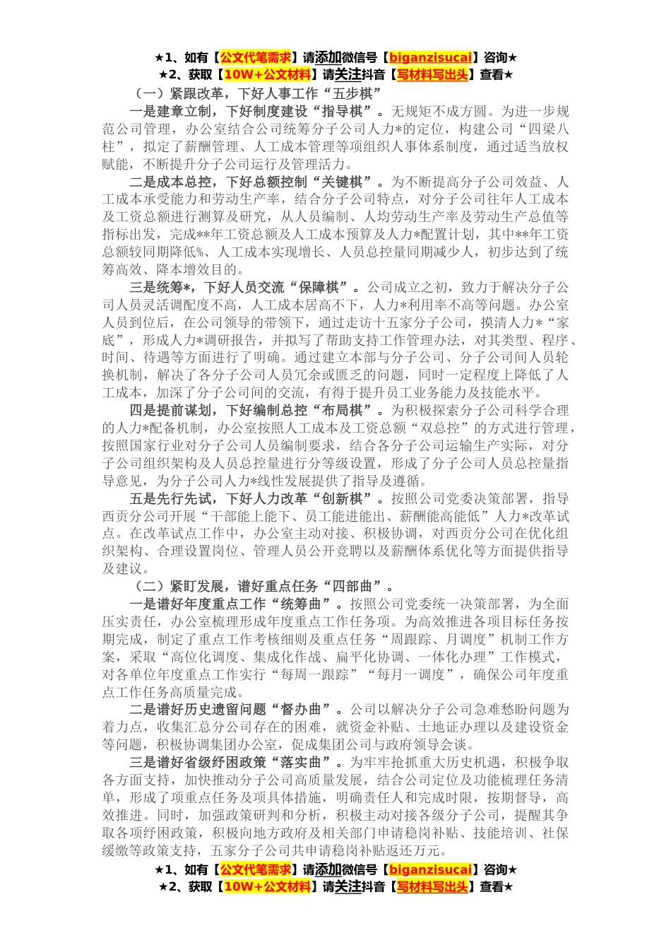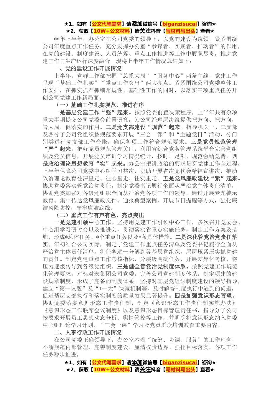 ★1、如有【公文代笔需求】请添加微信号【biganzisucai】咨询★★2、获取【10W+公文材料】请关注抖音【写材料写出头】查看★**年上半年,办公室在公司党委的领导下,以党的建设为统领,紧紧围绕公司年度重点工作任务,充分发挥办公室“参谋者、实践者、推动者”的作用,在党的建设、制度建设、人员统筹、重点工作推进等工作中履职尽责,推进党建工作与生产运行深度融合。现将上半年工作情况总结如下:一、党的建设工作开展情况上半年,党群工作部把握“总揽大局”“服务中心”两条主线,党建工作呈现“基础工作扎实”“重点工作突出”两大亮点。紧紧围绕公司党委整体工作安排,在抓实抓严抓细常规性、基础性工作的同时,以落实三项重点任务开创公司党建工作新局面。(一)基础工作扎实规范、推进有序一是基层党建...