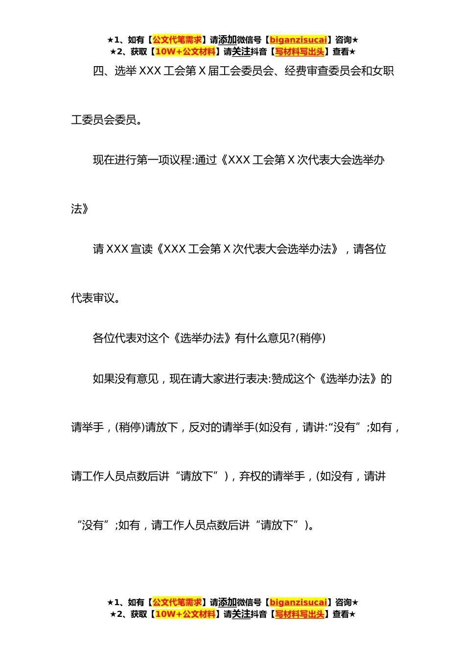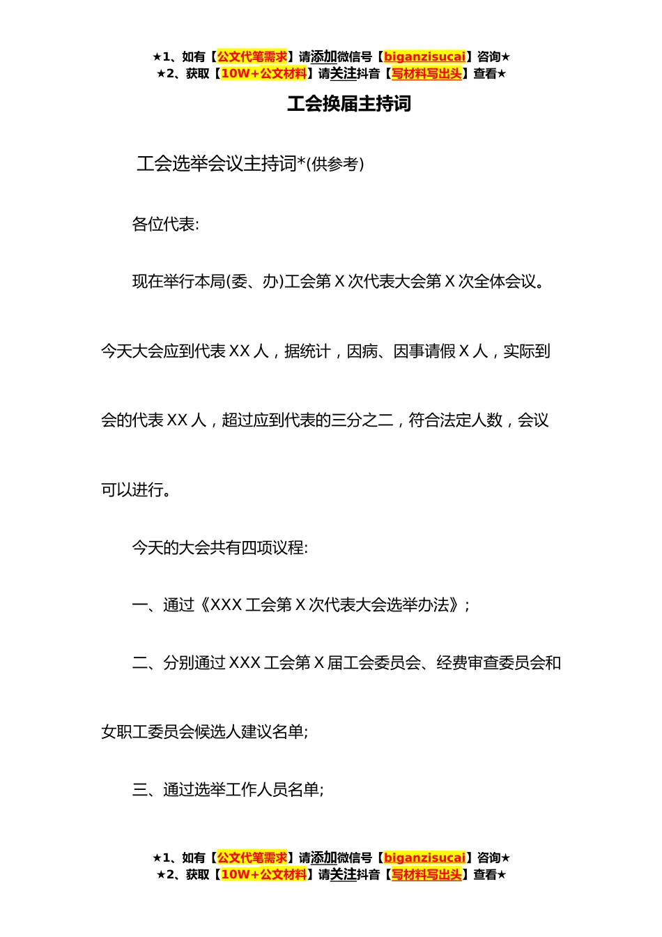 ★1、如有【公文代笔需求】请添加微信号【biganzisucai】咨询★★2、获取【10W+公文材料】请关注抖音【写材料写出头】查看★工会换届主持词工会选举会议主持词*(供参考)各位代表:现在举行本局(委、办)工会第X次代表大会第X次全体会议。今天大会应到代表XX人,据统计,因病、因事请假X人,实际到会的代表XX人,超过应到代表的三分之二,符合法定人数,会议可以进行。今天的大会共有四项议程:一、通过《XXX工会第X次代表大会选举办法》;二、分别通过XXX工会第X届工会委员会、经费审查委员会和女职工委员会候选人建议名单;三、通过选举工作人员名单;★1、如有【公文代笔需求】请添加微信号【biganzisucai】咨询★★2、获取【10W+公文材料】请关注抖音【写材料写出头】查看★★1、如有【公文代笔需求】请添加微信号【b...