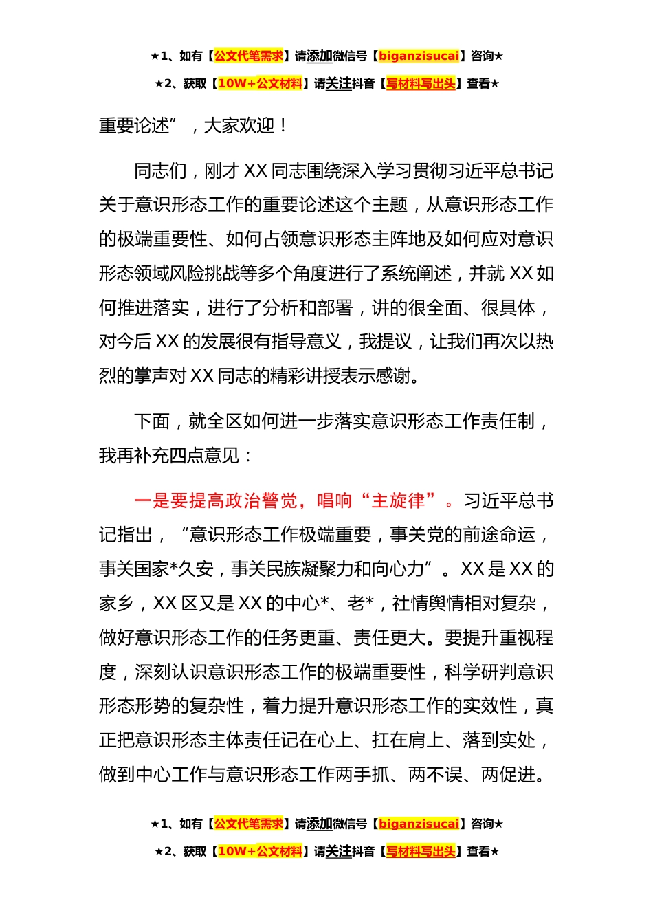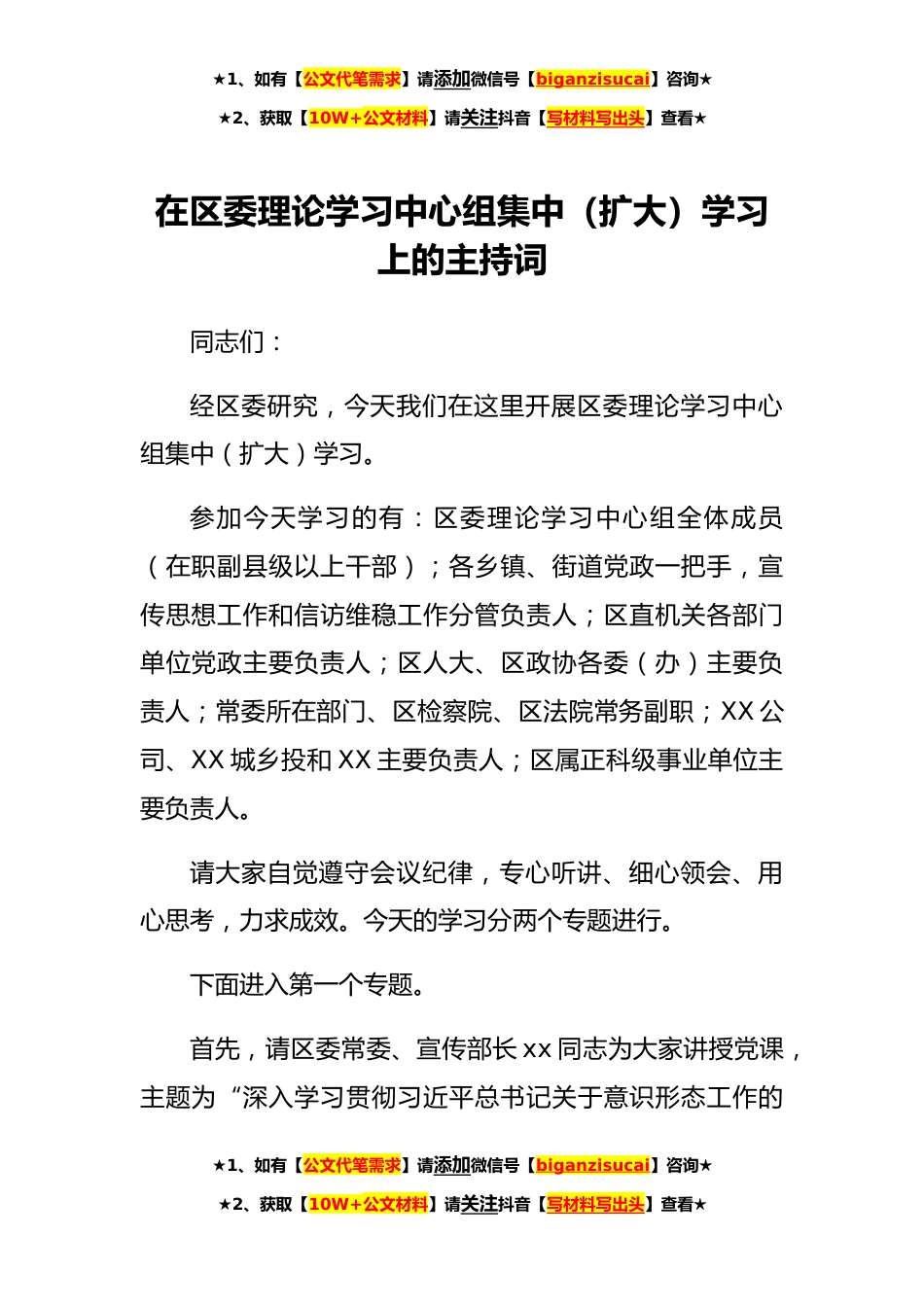 ★1、如有【公文代笔需求】请添加微信号【biganzisucai】咨询★★2、获取【10W+公文材料】请关注抖音【写材料写出头】查看★在区委理论学习中心组集中(扩大)学习上的主持词同志们:经区委研究,今天我们在这里开展区委理论学习中心组集中(扩大)学习。参加今天学习的有:区委理论学习中心组全体成员(在职副县级以上干部);各乡镇、街道党政一把手,宣传思想工作和信访维稳工作分管负责人;区直机关各部门单位党政主要负责人;区人大、区政协各委(办)主要负责人;常委所在部门、区检察院、区法院常务副职;XX公司、XX城乡投和XX主要负责人;区属正科级事业单位主要负责人。请大家自觉遵守会议纪律,专心听讲、细心领会、用心思考,力求成效。今天的学习分两个专题进行。下面进入第一个专题。首先,请区委常...