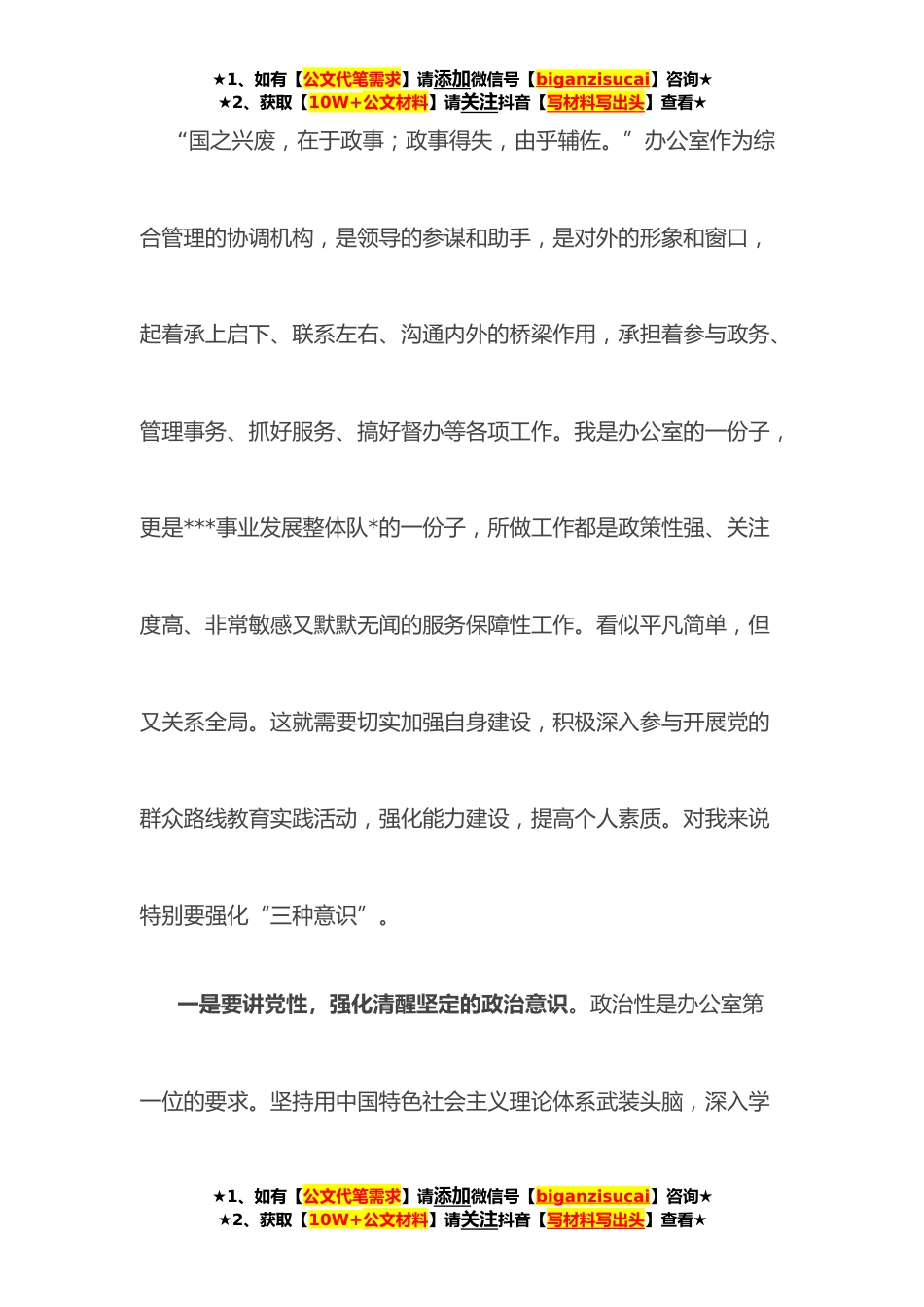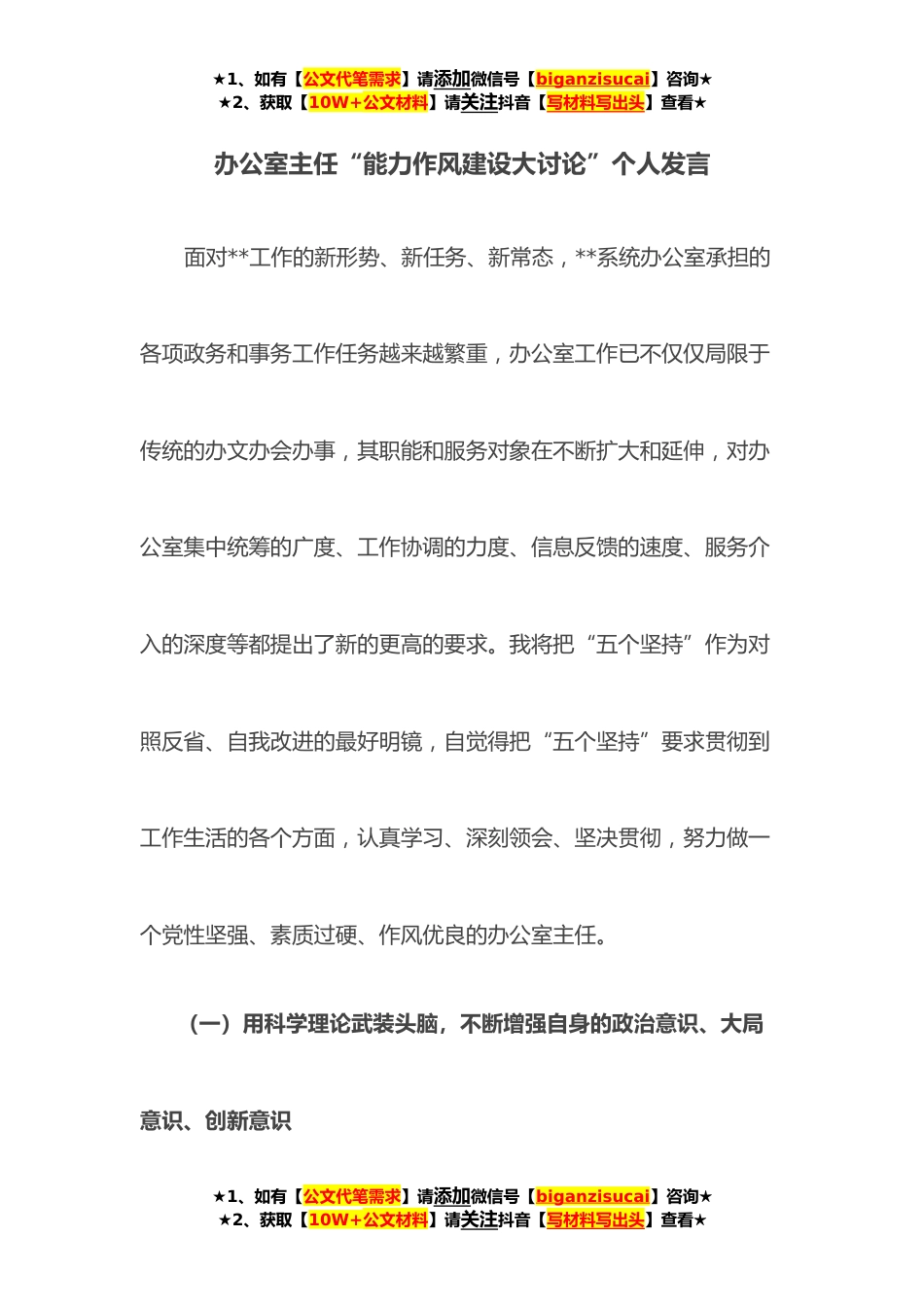 ★1、如有【公文代笔需求】请添加微信号【biganzisucai】咨询★★2、获取【10W+公文材料】请关注抖音【写材料写出头】查看★办公室主任“能力作风建设大讨论”个人发言面对**工作的新形势、新任务、新常态,**系统办公室承担的各项政务和事务工作任务越来越繁重,办公室工作已不仅仅局限于传统的办文办会办事,其职能和服务对象在不断扩大和延伸,对办公室集中统筹的广度、工作协调的力度、信息反馈的速度、服务介入的深度等都提出了新的更高的要求。我将把“五个坚持”作为对照反省、自我改进的最好明镜,自觉得把“五个坚持”要求贯彻到工作生活的各个方面,认真学习、深刻领会、坚决贯彻,努力做一个党性坚强、素质过硬、作风优良的办公室主任。(一)用科学理论武装头脑,不断增强自身的政治意识、大局意识、...