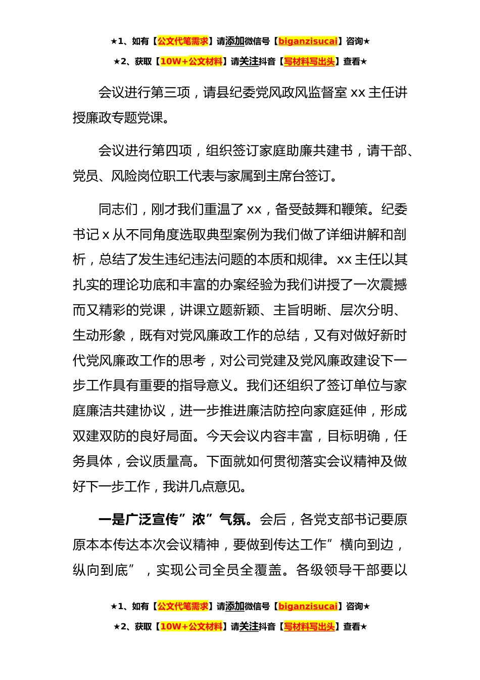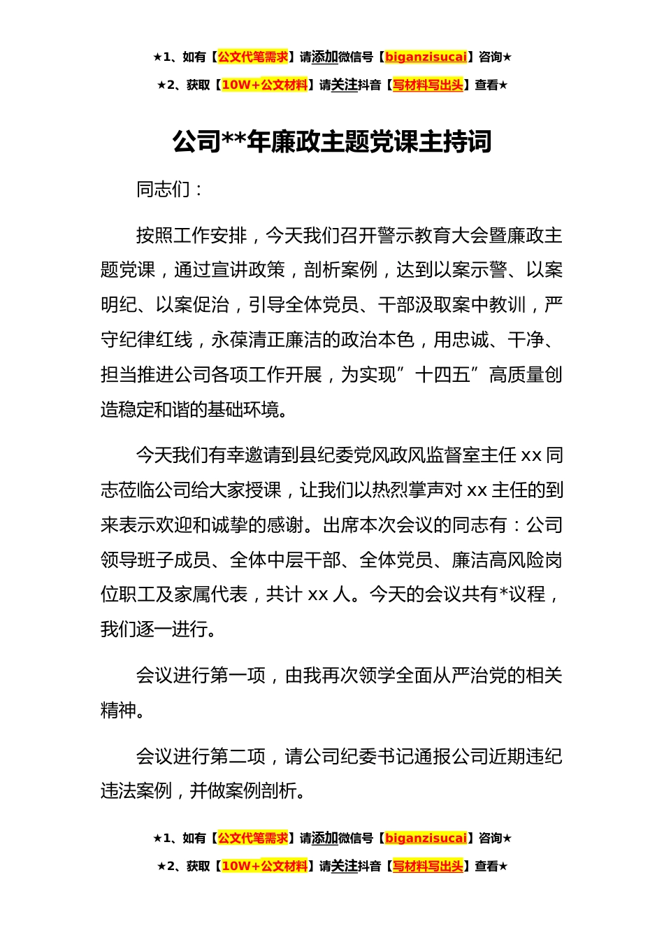 ★1、如有【公文代笔需求】请添加微信号【biganzisucai】咨询★★2、获取【10W+公文材料】请关注抖音【写材料写出头】查看★公司**年廉政主题党课主持词同志们:按照工作安排,今天我们召开警示教育大会暨廉政主题党课,通过宣讲政策,剖析案例,达到以案示警、以案明纪、以案促治,引导全体党员、干部汲取案中教训,严守纪律红线,永葆清正廉洁的政治本色,用忠诚、干净、担当推进公司各项工作开展,为实现”十四五”高质量创造稳定和谐的基础环境。今天我们有幸邀请到县纪委党风政风监督室主任xx同志莅临公司给大家授课,让我们以热烈掌声对xx主任的到来表示欢迎和诚挚的感谢。出席本次会议的同志有:公司领导班子成员、全体中层干部、全体党员、廉洁高风险岗位职工及家属代表,共计xx人。今天的会议共有*议程,...