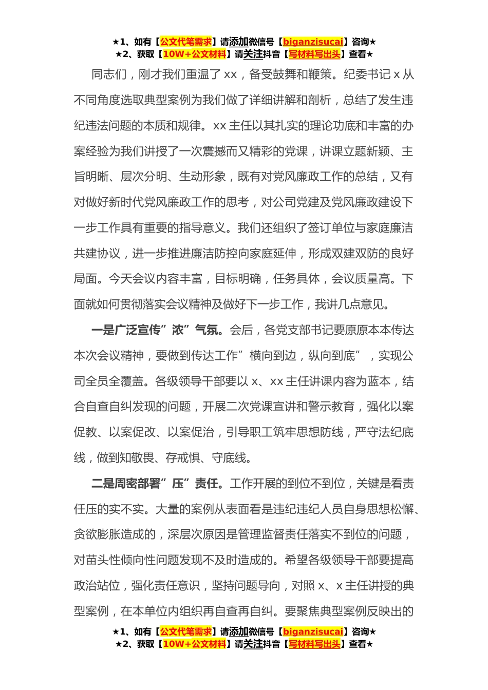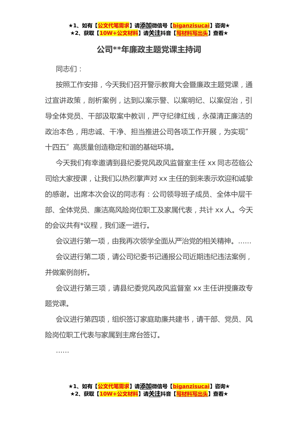 ★1、如有【公文代笔需求】请添加微信号【biganzisucai】咨询★★2、获取【10W+公文材料】请关注抖音【写材料写出头】查看★公司**年廉政主题党课主持词同志们:按照工作安排,今天我们召开警示教育大会暨廉政主题党课,通过宣讲政策,剖析案例,达到以案示警、以案明纪、以案促治,引导全体党员、干部汲取案中教训,严守纪律红线,永葆清正廉洁的政治本色,用忠诚、干净、担当推进公司各项工作开展,为实现”十四五”高质量创造稳定和谐的基础环境。今天我们有幸邀请到县纪委党风政风监督室主任xx同志莅临公司给大家授课,让我们以热烈掌声对xx主任的到来表示欢迎和诚挚的感谢。出席本次会议的同志有:公司领导班子成员、全体中层干部、全体党员、廉洁高风险岗位职工及家属代表,共计xx人。今天的会议共有*议程,...