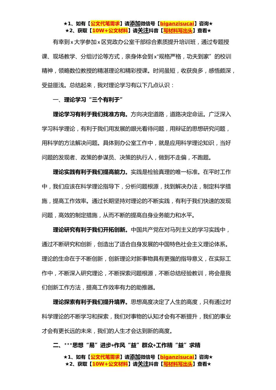 ★1、如有【公文代笔需求】请添加微信号【biganzisucai】咨询★★2、获取【10W+公文材料】请关注抖音【写材料写出头】查看★有幸到x大学参加x区党政办公室干部综合素质提升培训班,通过专题授课、现场教学、分组讨论等方式,亲身体会到x“规格严格,功夫到家”的校训精神,领略数位教授的精湛理论和精彩授课。时间虽短,收获良多,感悟颇深,受益匪浅。总结起来,我对理论学习有以下几点认识:一、理论学习“三个有利于”理论学习有利于我们找准方向。方向决定道路,道路决定命运。广泛深入学习科学理论,有利于我们用发展的眼光看待问题,用辩证的思想研究问题,用科学的方法解决问题。具体到办公室工作中,就是应用科学理论知识,当好问题的发现者、政策的参谋员、决策的执行人,做到不走偏,不跑题。理论实践有...