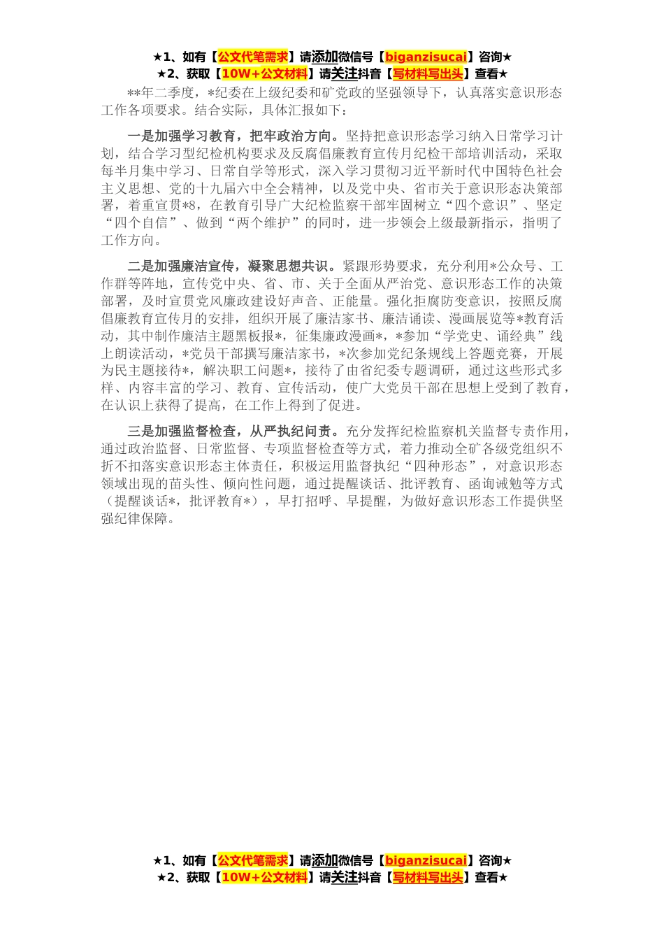 ★1、如有【公文代笔需求】请添加微信号【biganzisucai】咨询★★2、获取【10W+公文材料】请关注抖音【写材料写出头】查看★**年二季度,*纪委在上级纪委和矿党政的坚强领导下,认真落实意识形态工作各项要求。结合实际,具体汇报如下:一是加强学习教育,把牢政治方向。坚持把意识形态学习纳入日常学习计划,结合学习型纪检机构要求及反腐倡廉教育宣传月纪检干部培训活动,采取每半月集中学习、日常自学等形式,深入学习贯彻习近平新时代中国特色社会主义思想、党的十九届六中全会精神,以及党中央、省市关于意识形态决策部署,着重宣贯*8,在教育引导广大纪检监察干部牢固树立“四个意识”、坚定“四个自信”、做到“两个维护”的同时,进一步领会上级最新指示,指明了工作方向。二是加强廉洁宣传,凝聚思想共识...