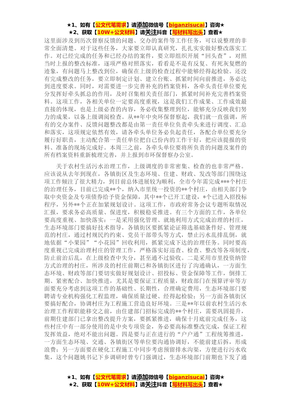 ★1、如有【公文代笔需求】请添加微信号【biganzisucai】咨询★★2、获取【10W+公文材料】请关注抖音【写材料写出头】查看★在全市环境问题整改暨农村生活污水治理推进会议上的主持讲话同志们:今天这次会议,主要是贯彻落实省、**市近期一系列会议精神和市委、市政府的指示要求,对中央环保督察及“回头看”反馈问题、交办案件和有关环境问题整治、农村生活污水治理等工作进行调度部署。下面,请**同志通报有关情况。****************************************刚才,**同志通报了有关情况,讲的很具体,也很明确,请大家对号入座,主动认领,提高政治站位,集中力量攻坚,不折不扣整改,以良好成效迎接省第三轮生态环保督察。应该说,对于生态环保工作,市委、市政府主要领导高度重视,***市长就问题整改、污水治...