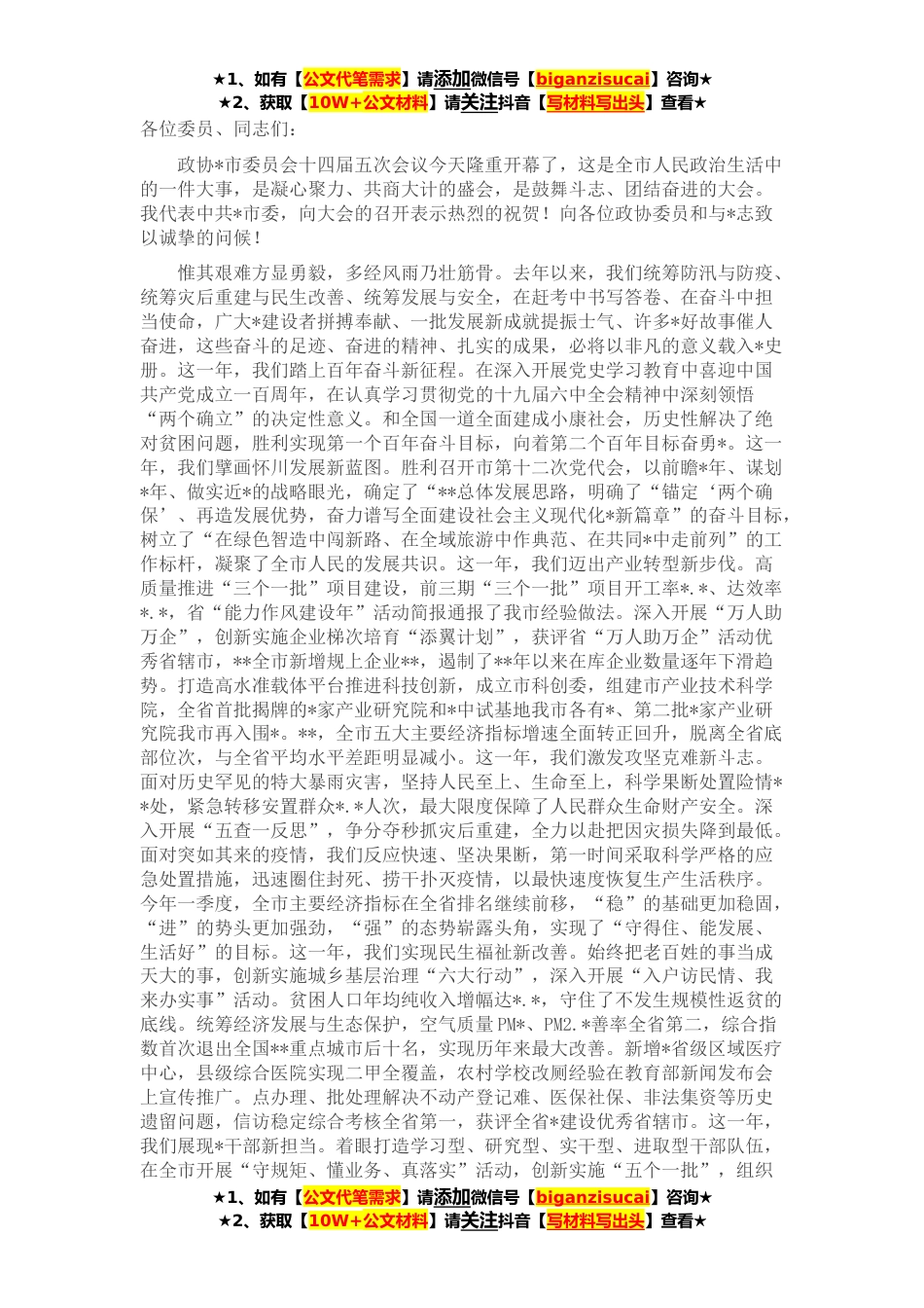 ★1、如有【公文代笔需求】请添加微信号【biganzisucai】咨询★★2、获取【10W+公文材料】请关注抖音【写材料写出头】查看★各位委员、同志们:政协*市委员会十四届五次会议今天隆重开幕了,这是全市人民政治生活中的一件大事,是凝心聚力、共商大计的盛会,是鼓舞斗志、团结奋进的大会。我代表中共*市委,向大会的召开表示热烈的祝贺!向各位政协委员和与*志致以诚挚的问候!惟其艰难方显勇毅,多经风雨乃壮筋骨。去年以来,我们统筹防汛与防疫、统筹灾后重建与民生改善、统筹发展与安全,在赶考中书写答卷、在奋斗中担当使命,广大*建设者拼搏奉献、一批发展新成就提振士气、许多*好故事催人奋进,这些奋斗的足迹、奋进的精神、扎实的成果,必将以非凡的意义载入*史册。这一年,我们踏上百年奋斗新征程。在深入...
