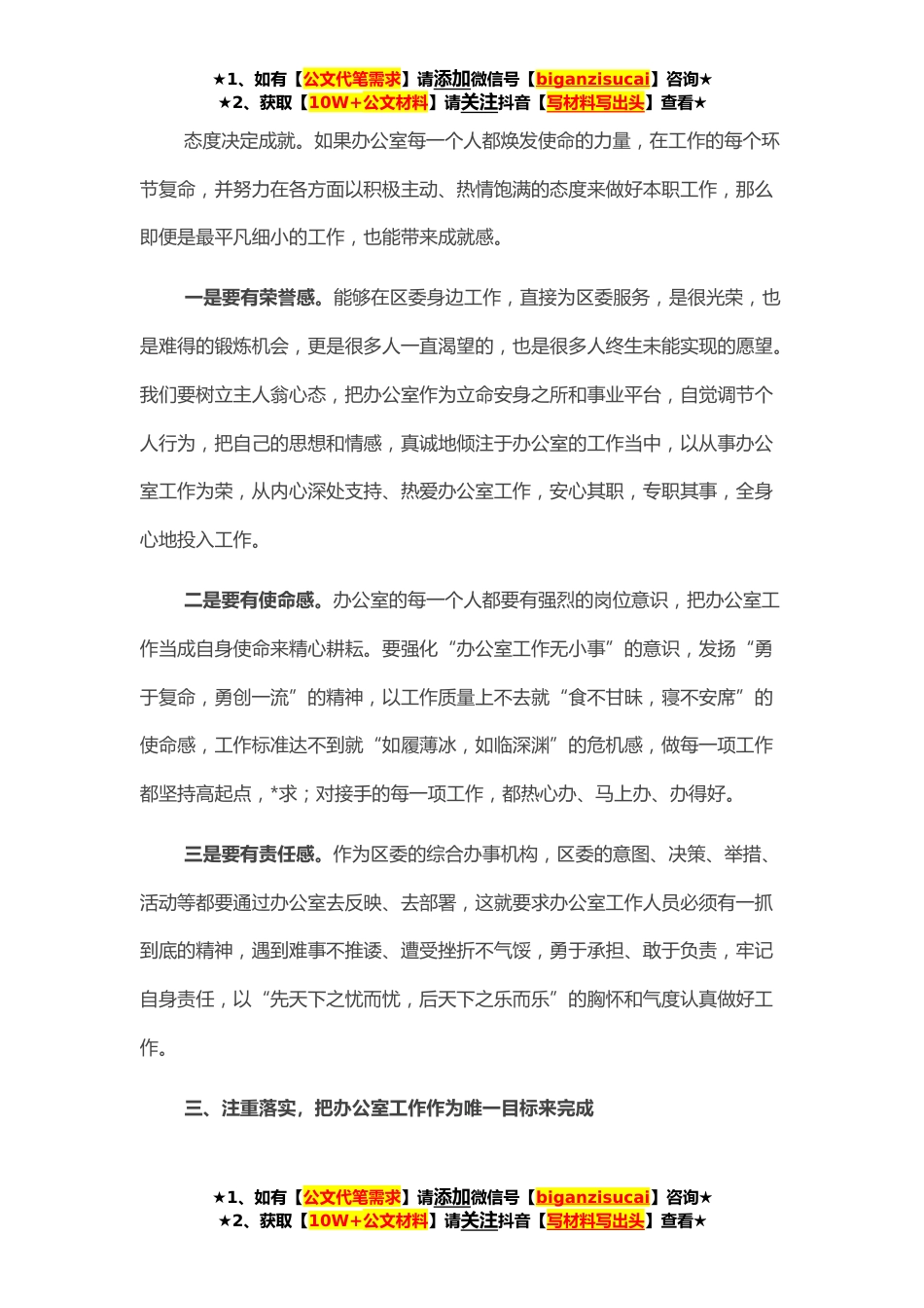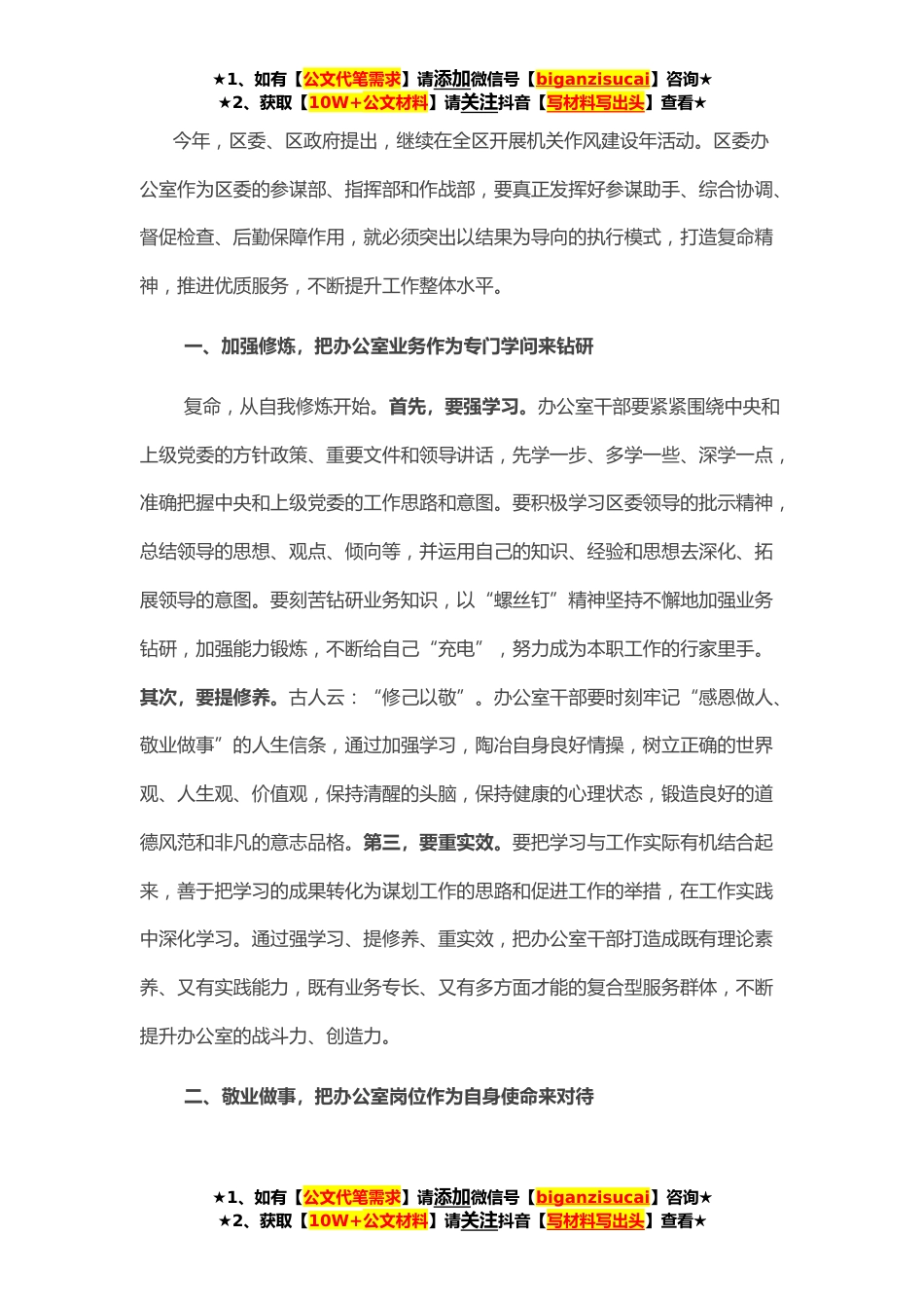 ★1、如有【公文代笔需求】请添加微信号【biganzisucai】咨询★★2、获取【10W+公文材料】请关注抖音【写材料写出头】查看★今年,区委、区政府提出,继续在全区开展机关作风建设年活动。区委办公室作为区委的参谋部、指挥部和作战部,要真正发挥好参谋助手、综合协调、督促检查、后勤保障作用,就必须突出以结果为导向的执行模式,打造复命精神,推进优质服务,不断提升工作整体水平。一、加强修炼,把办公室业务作为专门学问来钻研复命,从自我修炼开始。首先,要强学习。办公室干部要紧紧围绕中央和上级党委的方针政策、重要文件和领导讲话,先学一步、多学一些、深学一点,准确把握中央和上级党委的工作思路和意图。要积极学习区委领导的批示精神,总结领导的思想、观点、倾向等,并运用自己的知识、经验和思...