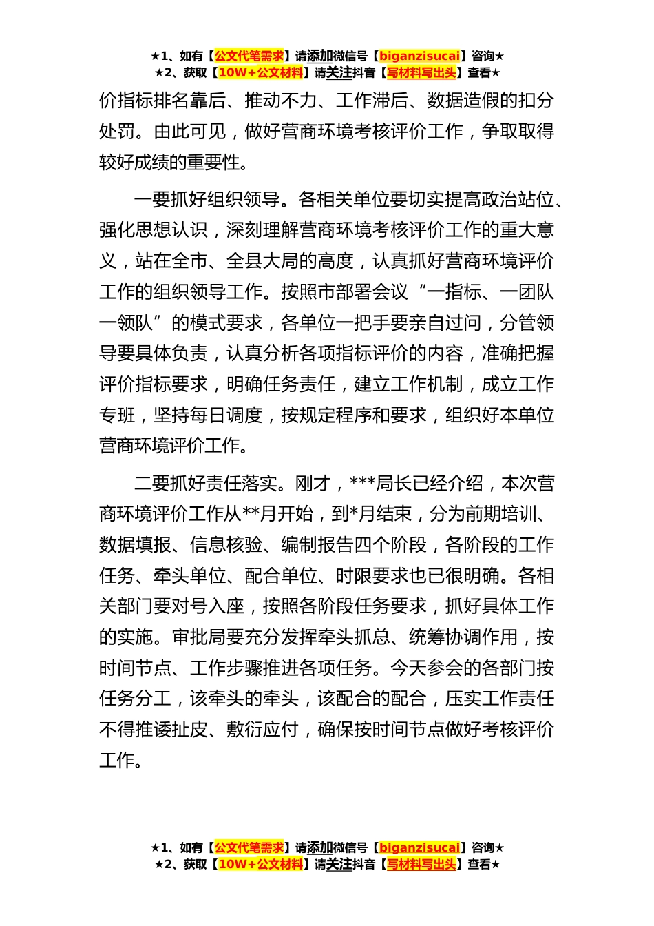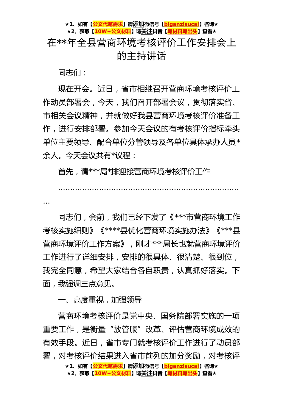 ★1、如有【公文代笔需求】请添加微信号【biganzisucai】咨询★★2、获取【10W+公文材料】请关注抖音【写材料写出头】查看★在**年全县营商环境考核评价工作安排会上的主持讲话同志们:现在开会。近日,省市相继召开营商环境考核评价工作动员部署会,今天,我们召开部署会议,贯彻落实省、市相关会议精神,并就做好我县营商环境考核评价准备工作,进行安排部署。参加今天会议的有考核评价指标牵头单位主要领导、配合单位分管领导及各单位具体承办人员*余人。今天会议共有*议程:首先,请***局*排迎接营商环境考核评价工作..............................................................................同志们,会前,我们已经下发了《***市营商环境工作考核实施细则》《****县优化营商环境实施办法》《***县营...