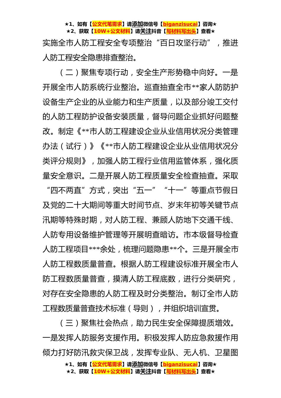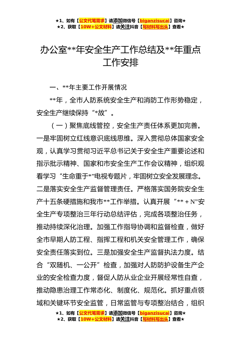 ★1、如有【公文代笔需求】请添加微信号【biganzisucai】咨询★★2、获取【10W+公文材料】请关注抖音【写材料写出头】查看★办公室**年安全生产工作总结及**年重点工作安排一、**年主要工作开展情况**年,全市人防系统安全生产和消防工作形势稳定,安全生产继续保持“*故”。(一)聚焦底线管控,安全生产责任体系更加完善。一是牢固树立红线意识底线思维。深入贯彻总体国家安全观,认真学习贯彻习近平总书记关于安全生产重要论述和指示批示精神、国家和市安全生产工作会议精神,组织观看学习“生命重于*”电视专题片,牢固树立安全发展理念。二是落实安全生产监督管理责任。严格落实国务院安全生产十五条硬措施和我市**工作举措。认真开展“**+N”安全生产专项整治三年行动总结评估,完成各项整治任务,推动持续...