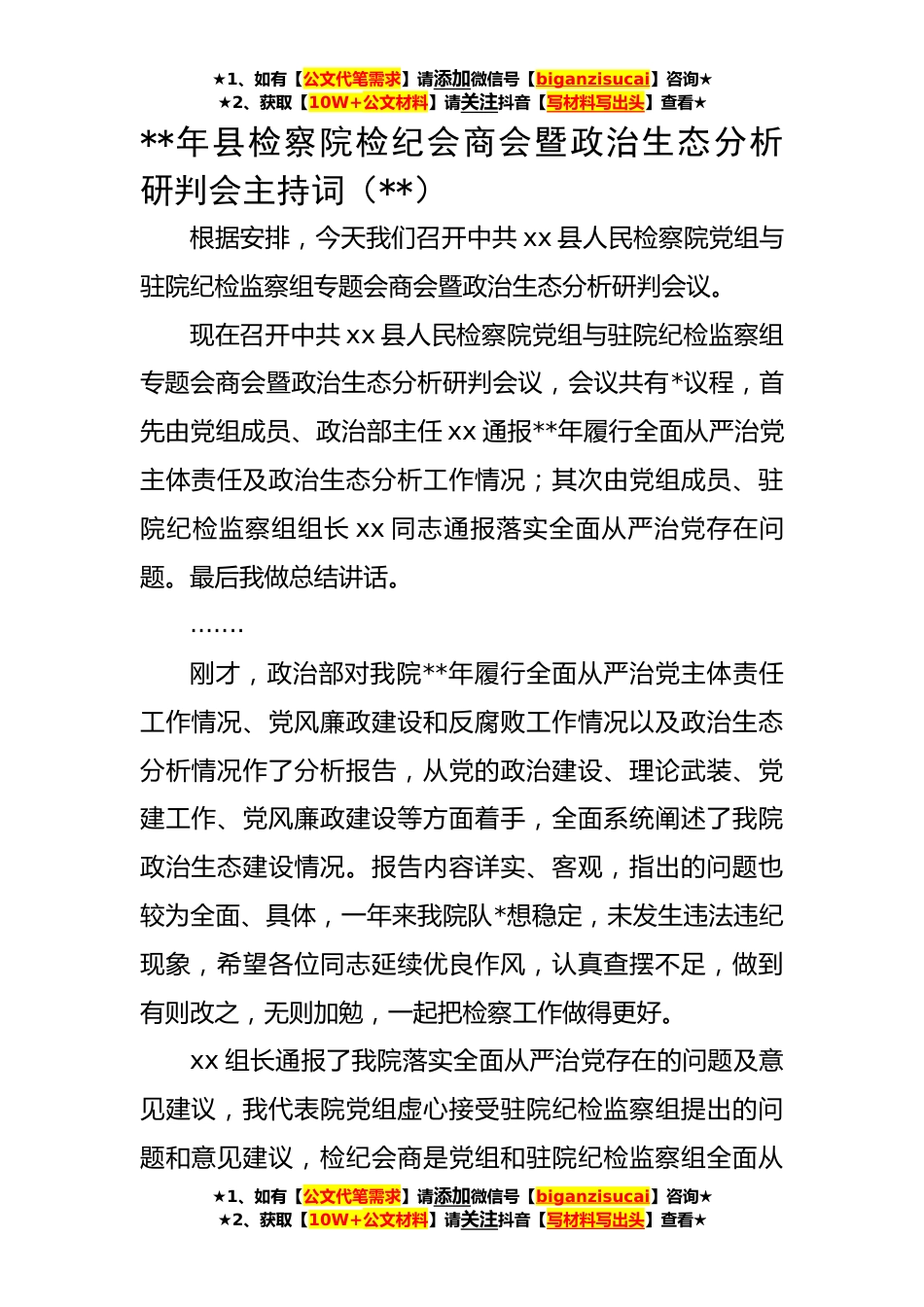 ★1、如有【公文代笔需求】请添加微信号【biganzisucai】咨询★★2、获取【10W+公文材料】请关注抖音【写材料写出头】查看★**年县检察院检纪会商会暨政治生态分析研判会主持词(**)根据安排,今天我们召开中共xx县人民检察院党组与驻院纪检监察组专题会商会暨政治生态分析研判会议。现在召开中共xx县人民检察院党组与驻院纪检监察组专题会商会暨政治生态分析研判会议,会议共有*议程,首先由党组成员、政治部主任xx通报**年履行全面从严治党主体责任及政治生态分析工作情况;其次由党组成员、驻院纪检监察组组长xx同志通报落实全面从严治党存在问题。最后我做总结讲话。.......刚才,政治部对我院**年履行全面从严治党主体责任工作情况、党风廉政建设和反腐败工作情况以及政治生态分析情况作了分析报告,从党的...
